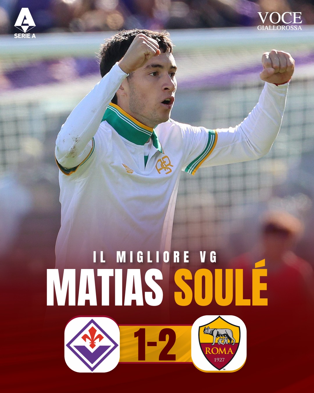 Dopo la deludente sconfitta europea contro il Lille, la Roma vince 1-2 al Franchi contro la Fiorentina e mantiene la vetta della Serie A. I padroni di casa passano in vantaggio al 14’ con Kean, ma la squadra di Gasperini reagisce subito: Soulé firma l’1-1 con un preciso sinistro dopo una bella combinazione offensiva. Nella ripresa è Cristante, con un colpo di testa su calcio d’angolo, a completare la rimonta e regalare ai giallorossi tre punti pesantissimi. Grazie alla splendiida rete segnata e l'assist perfetto da calcio d'angolo, Matias Soulé è stato eletto come #IlMiglioreVG del match attraverso i canali social di Vocegiallorossa.it: X, Instagram, Facebook e Threads. Per l'argentino classe 2003 si tratta del secondo riconoscimento stagionale.