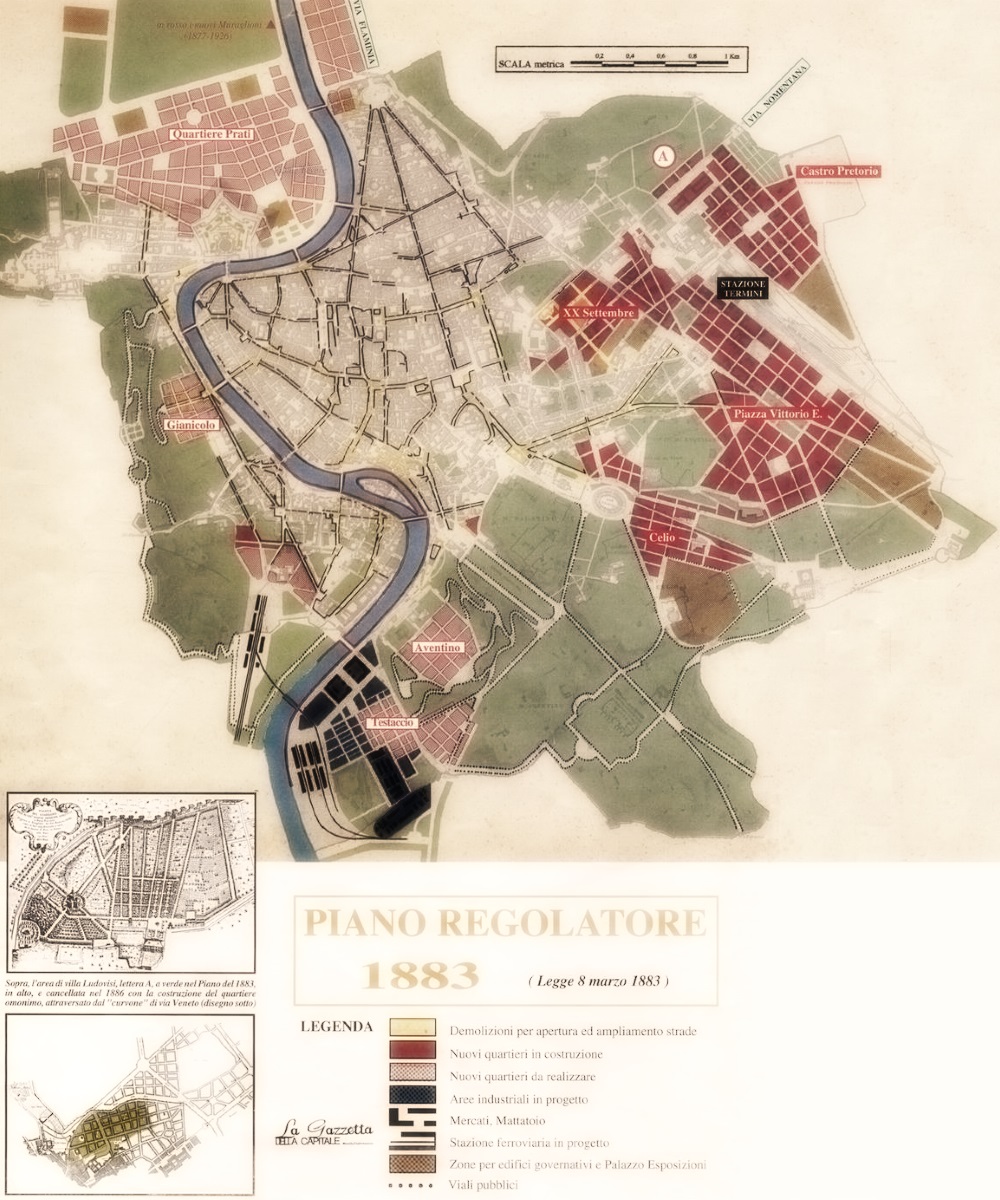 L’otto Novembre del 1883 viene approvato il primo Piano Regolatore di Roma: sarà quello che permetterà gli sventramenti e l'ingrandimento a macchia d'olio della città. Il precedente PRG del 1873 non era mai diventato Legge.