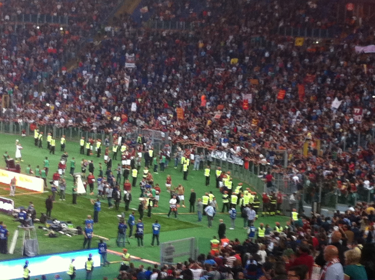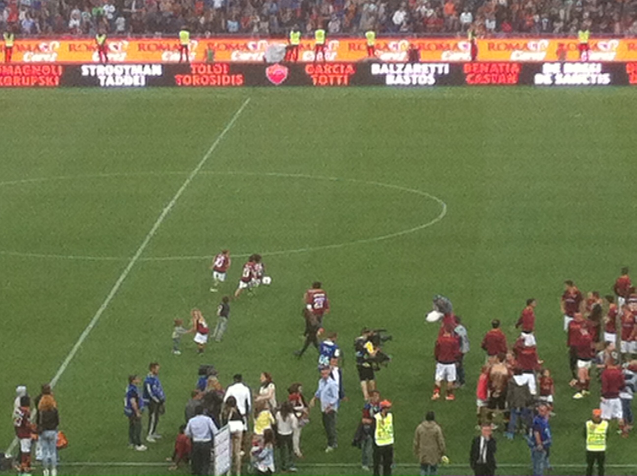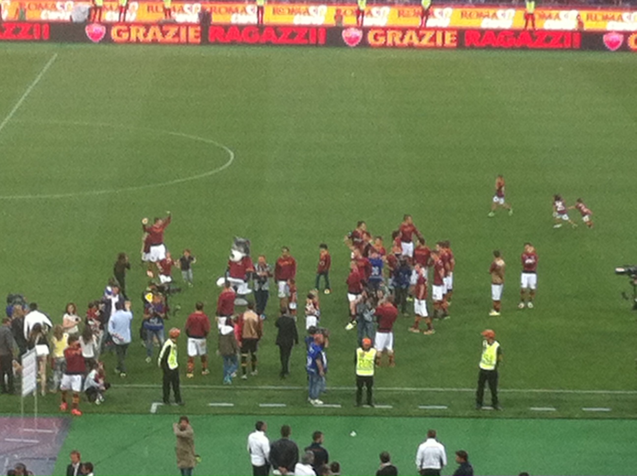 "Inizia il saluto al pubblico romanista: ogni giocatore è chiamato a centrocampo #SiamoLaRoma". Così, sul proprio profilo Twitter, la AS Roma ha annunciato l'inizio del giro di campo per la squadra, che raccoglie gli applausi dei tifosi per la straordinaria cavalcata di questa stagione, culminata nella qualificazione diretta alla Champions League.