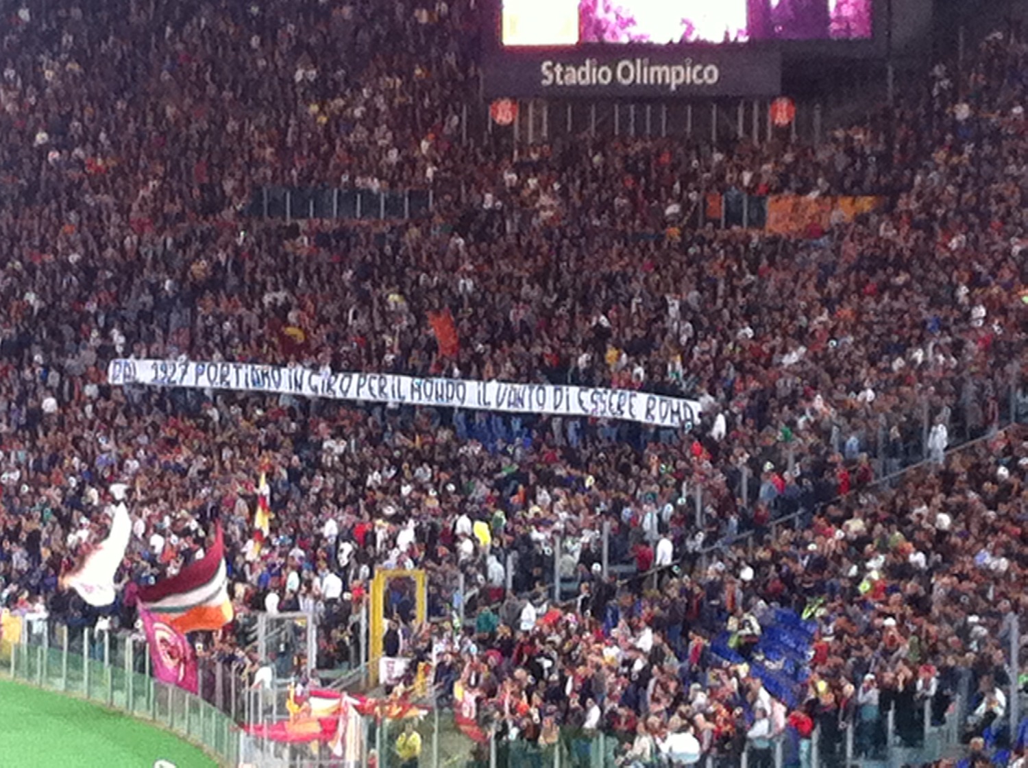 Curva Sud scatenata questa sera. Dagli spalti dell'Olimpico, all'inizio della ripresa di Roma-Milan, il settore più caldo del tifo giallorosso espone un altro striscione: "Dal 1927 portiamo in giro per il mondo il vanto di essere Roma".