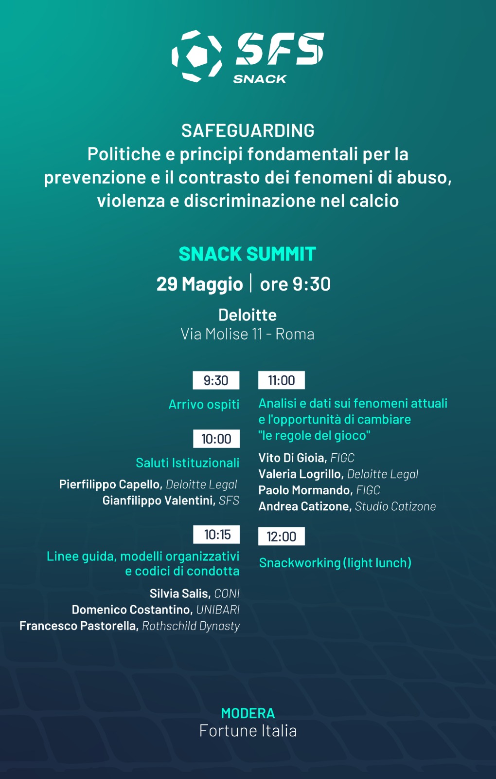 Lo Snack Summit di Roma, dedicato alla promozione di politiche e principi chiave per combattere gli abusi, la violenza e la discriminazione nel mondo del calcio, vedrà la partecipazione di illustri relatori e esperti del settore.