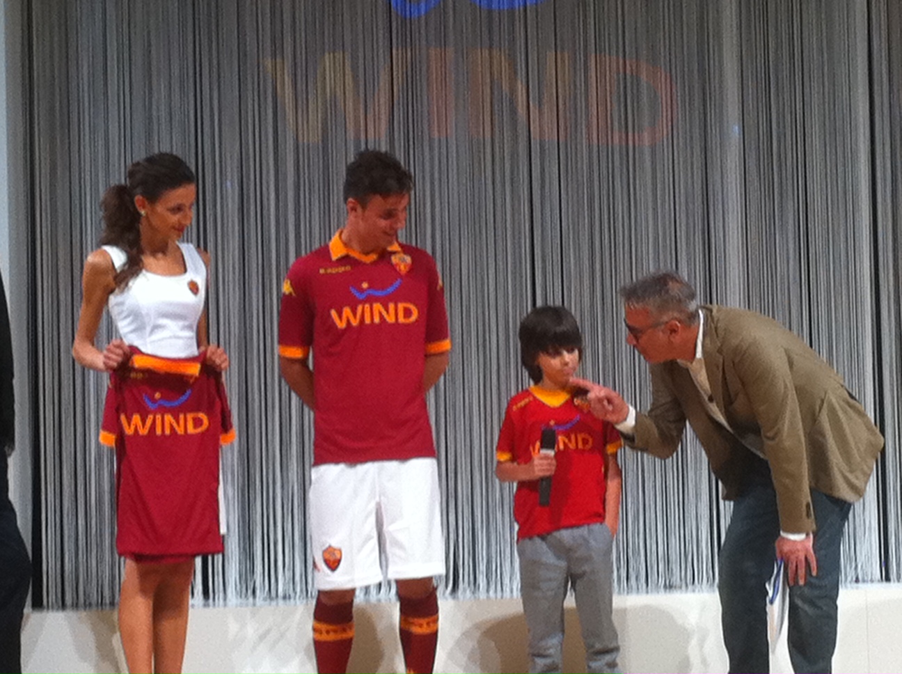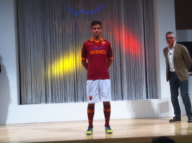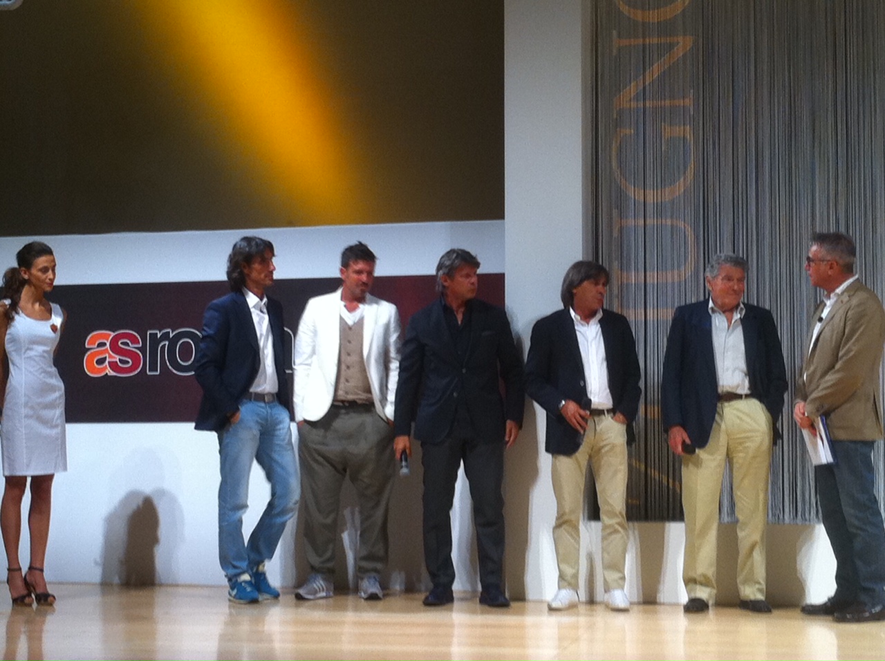 12.53 - Entra sul palco, dopo un video introduttivo, Valerio Verre, che indossa la nuova maglia della AS Roma per la stagione 2012/2013. Le parole del centrocampista: "Questa maglia, soprattutto per noi romani e romanisti, è molto importante. Dispiace per come è andata la semifinale con la Lazio, però vogliamo rifarci quest'anno e portare a Roma risultati che mancano da troppo tempo. Zeman? Ho già sentito Caprari, ci ha avvertiti che quest'estate si suderà molto (ride, ndr)".