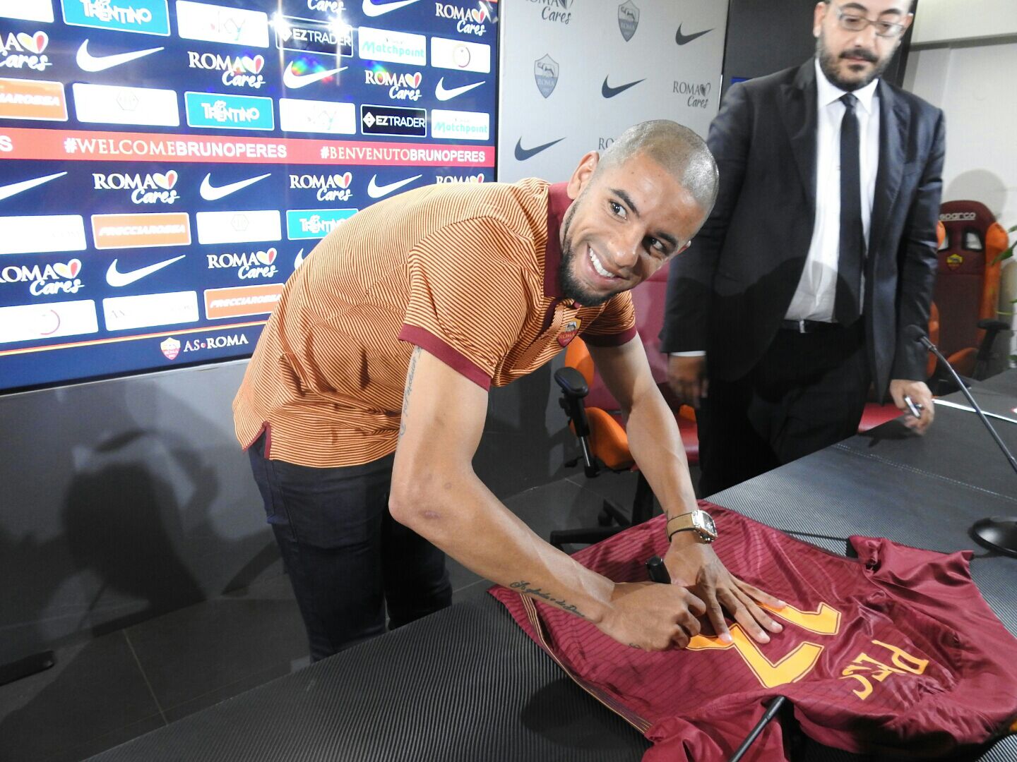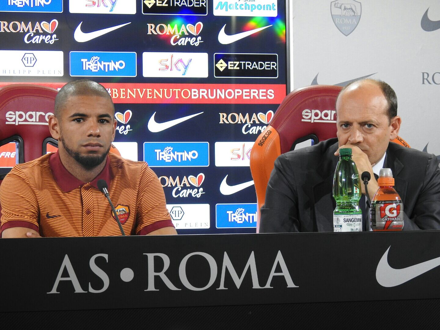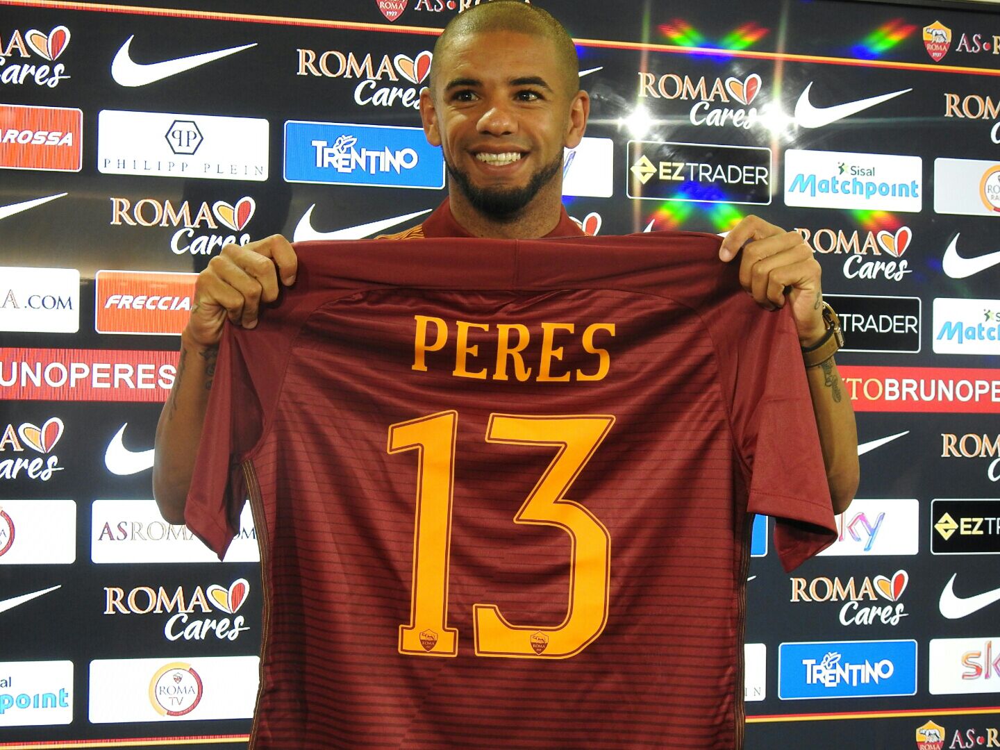 Questo pomeriggio il neo acquisto della Roma, Bruno Peres, è stato presentato al pubblico in diretta dalla sala stampa del centro sportivo Fulvio Bernardini di Trigoria. Il brasiliano, accompagnato dal direttore generale Mauro Baldissoni, si è dichiarato molto felice della scelta fatta, promettendo il massimo impegno per entrare nella storia del club e vincere lo scudetto. Vocegiallorossa.it, presente all'evento, vi propone i migliori scatti della presentazione di Bruno da Silva Peres.
