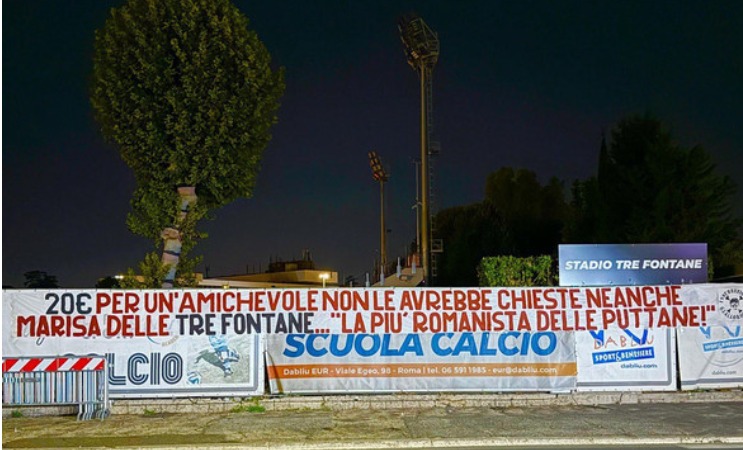 IL TESTO DELLO STRISCIONE - Il contenuto dello striscione, dai toni sarcastici e provocatori, ha preso di mira direttamente l’organizzazione dell’evento: «20€ per un’amichevole non le avrebbe chieste neanche Marisa delle Tre Fontane... la più romanista delle pu**ane!».