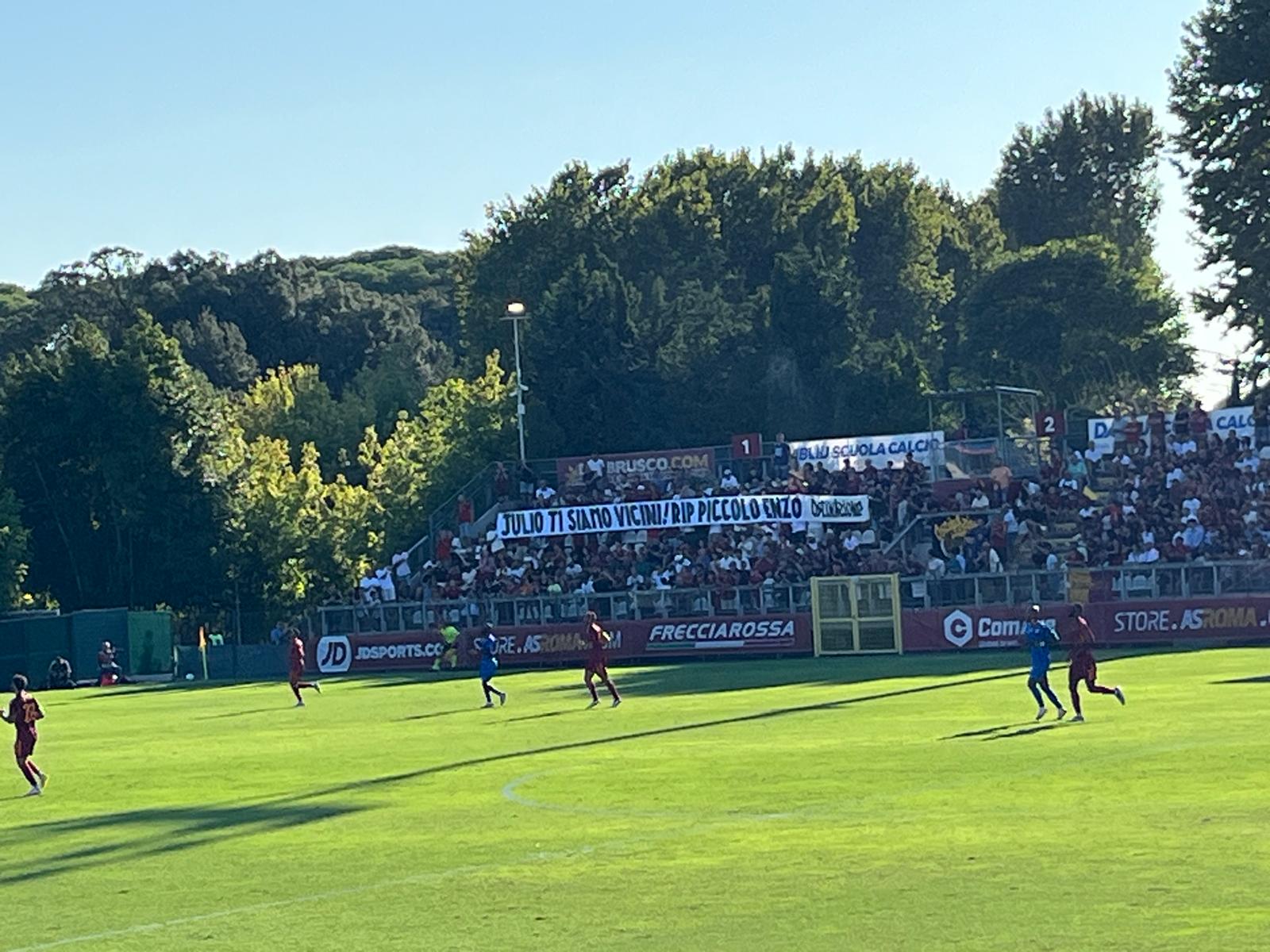 "Julio ti siamo vicini! RIP piccolo Enzo": con questo striscione, i tifosi della Roma presenti allo Stadio delle Tre Fontane hanno espresso la loro vicinanza all'ex portiere Julio Sergio, che ha perso suo figlio Enzo per una grave malattia. Tutto lo stadio ha ovviamente accolto l'esposizione della scritta, avvenuta al minuto 27 (numero di maglia di Julio Sergio con la Roma) con un lungo e caloroso applauso.