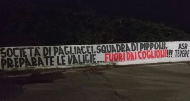 "Società di pagliacci, squadra di pipponi, preparate le valigie". Questo lo striscione affisso davanti al muro dell'ingresso al Centro Tecnico Fulvio Bernardini di Trigoria.