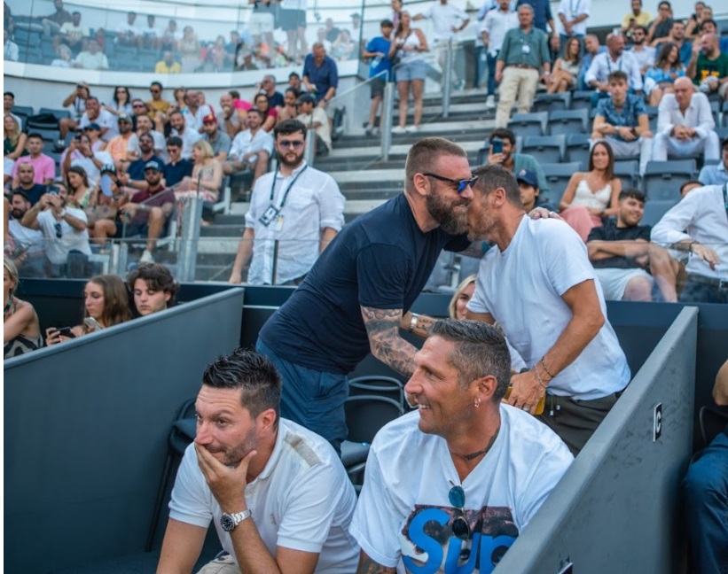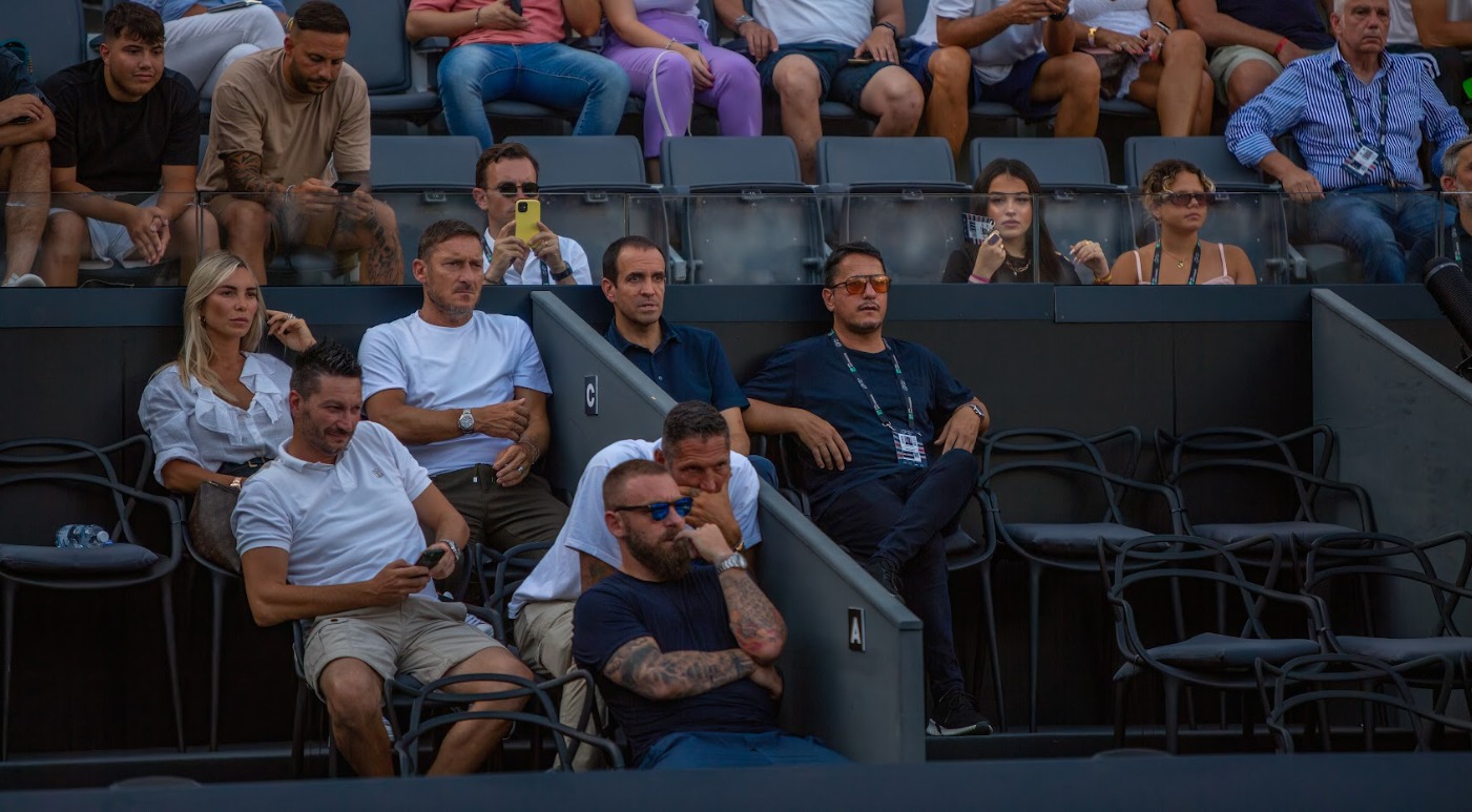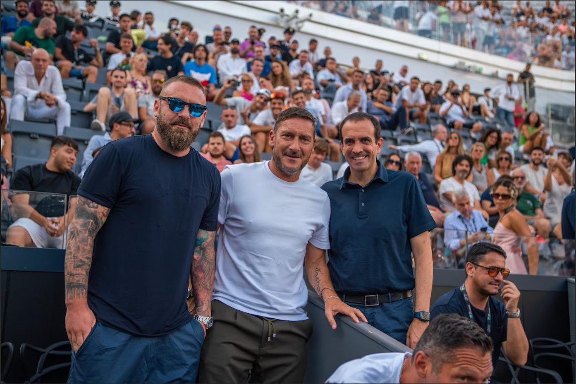 Francesco Totti, Daniele De Rossi e Marco Materazzi uno accanto all'altro, e il Foro Italico sembra Berlino. Tre campioni del mondo, due dei quali nella Capitale hanno scritto pagine indelebili della storia della Roma, in prima fila sul Centrale per le finali del BNL Italy Major Premier Padel. E con Totti, anche l'inseparabile compagna Noemi Bocchi. Tutti accomunati dall'amore per il padel, lo sport della seconda carriera dei calciatori che, una volta smesso di giocare, continuano a fare magie ma con la 'pala' in mano. Per De Rossi, tra l'altro, è la seconda presenza consecutiva sul Centrale: ieri aveva anche ricevuto la maglia da Martin Di Nenno, sconfitto in semifinale (in coppia con Franco Stupaczuk) da Arturo Coello e Agustin Tapia. Oggi, con DDR, anche quello che prima di lui ha indossato la fascia di capitano della Roma e Marco Materazzi, che nella finale del luglio di 17 anni fa segnò di testa, prima di uno dei rigori trasformati proprio da De Rossi nella serie che ha incoronato l'Italia campione del mondo. E quando le telecamere hanno inquadrato il box - accanto a quello occupato dal presidente della FIP Luigi Carraro, immortalato dai fotografi con i campioni del mondo 2006 -, è partita l'ovazione del Centrale, che anche stasera per le finali (prima quella femminile tra Josemaria/Sanchez e Ortega/Triay, poi quella maschile tra Coello/Tapia e Chingotto/Navarro) si è riempito.
