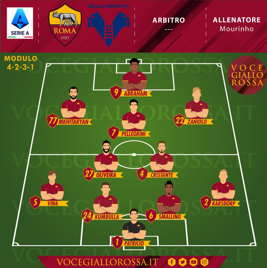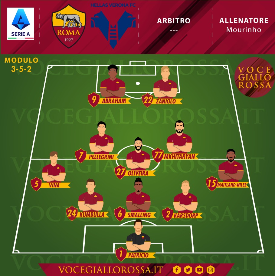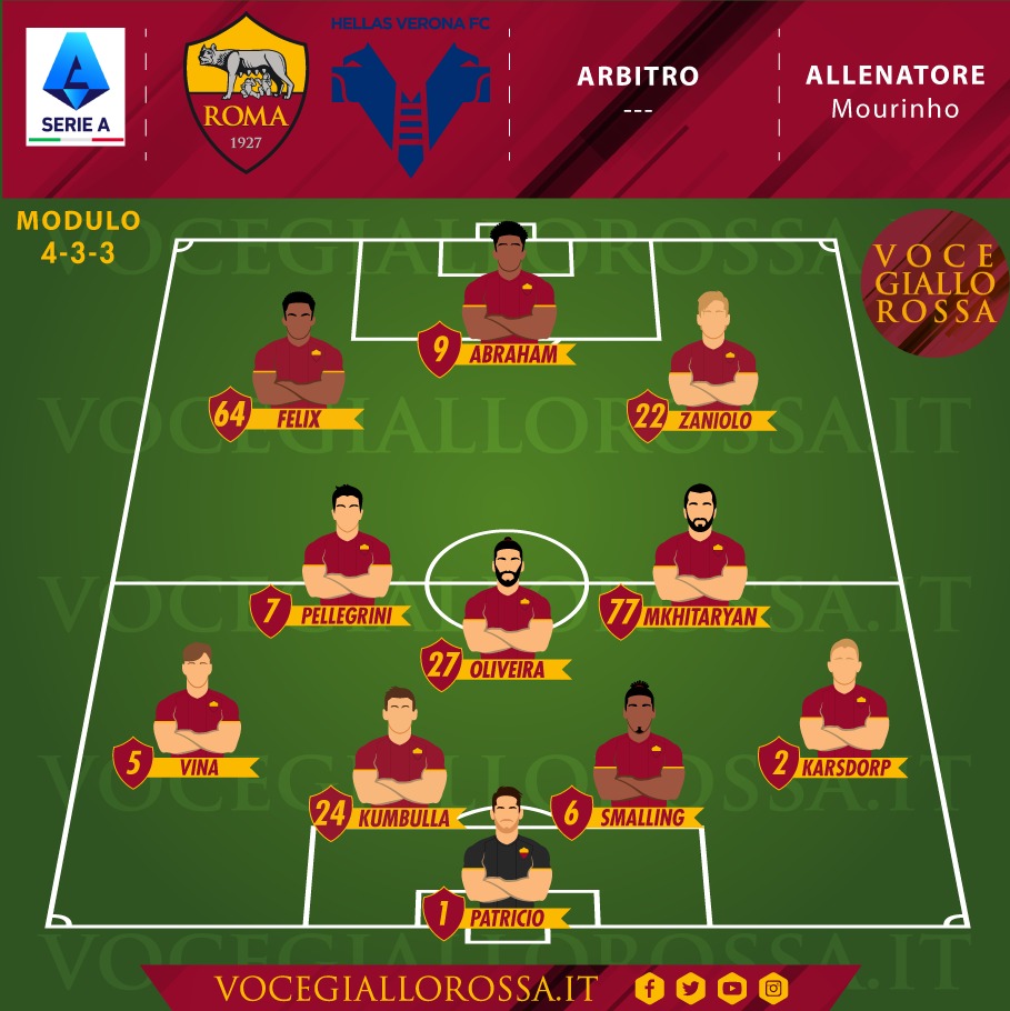 Probabile formazione (4-3-3): Rui Patricio; Karsdorp, Smalling, Kumbulla, Vina; Mkhitaryan, Oliveira, Pellegrini; Zaniolo, Abraham, Felix.