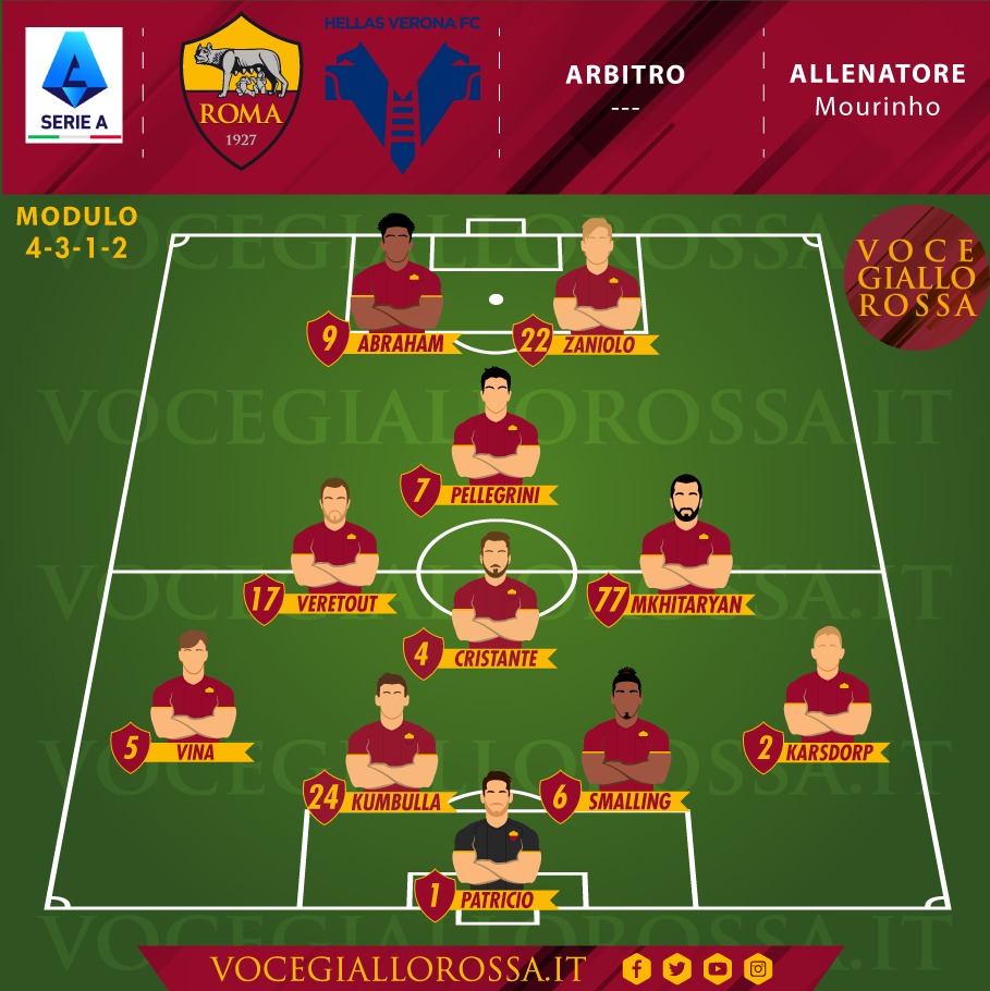 Probabile formazione (4-2-3-1): Rui Patricio; Karsdorp, Smalling, Kumbulla, Vina; Cristante, Oliveira; Zaniolo, Pellegrini, Mkhitaryan; Abraham.