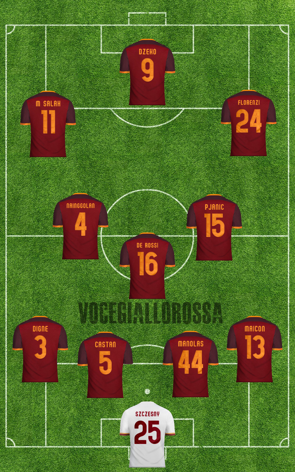 Roma (4-3-3): Szczesny; Maicon, Manolas, Castan, Digne; Pjanic, De Rossi, Nainggolan; Florenzi, Dzeko, Salah. All. Garcia