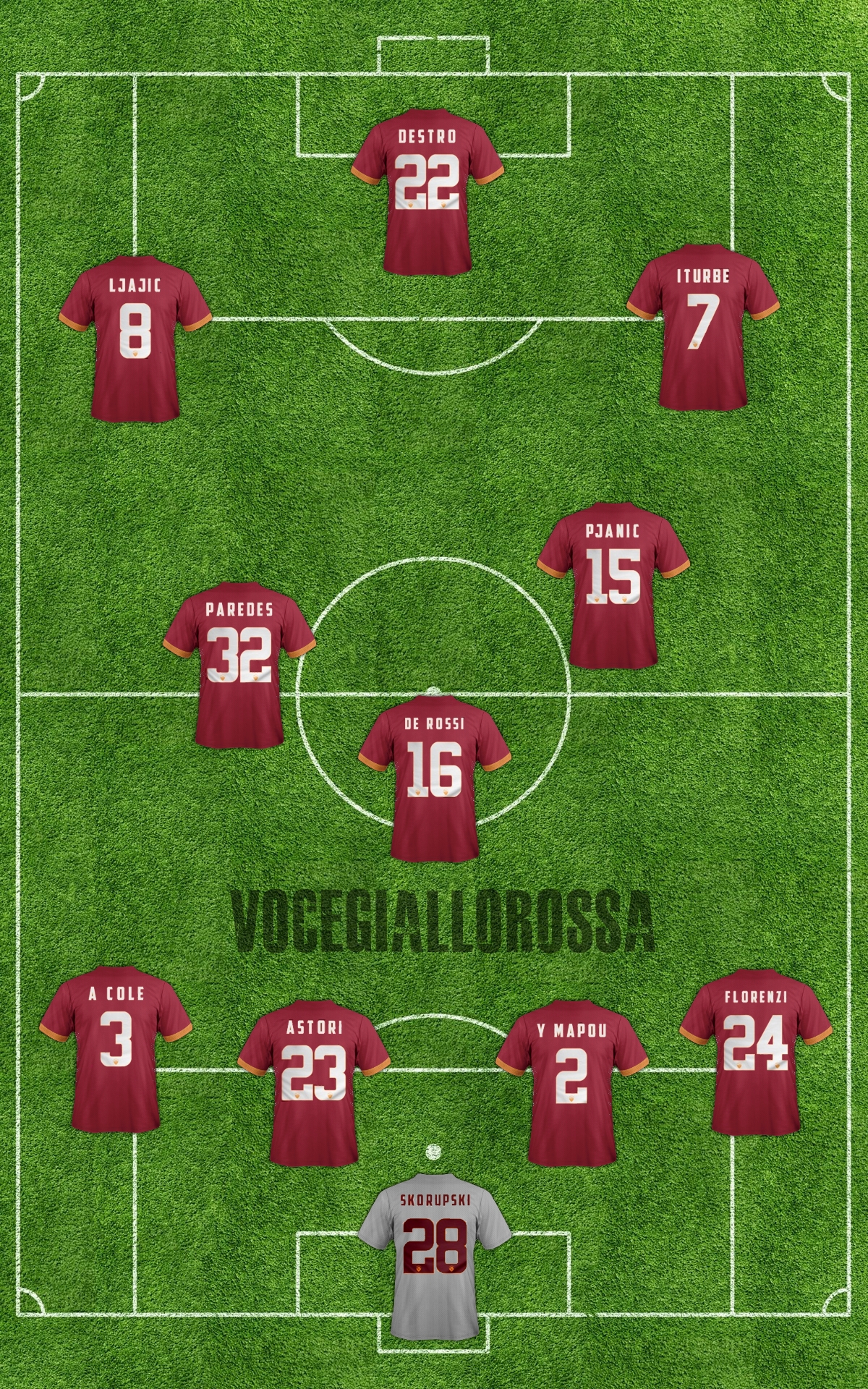 Roma (4-3-3): Skorupski; Florenzi, Yanga-Mbiwa, Astori, Cole; Pjanic, De Rossi, Paredes; Iturbe, Destro, Ljajic. All. Garcia