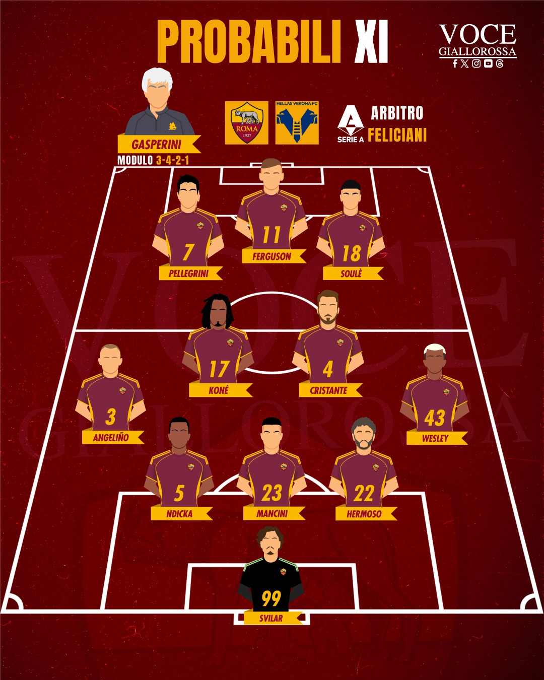 ROMA (3-4-2-1): Svilar; Hermoso, Mancini, Ndicka; Wesley, Cristante, Koné, Angelino; Soulé, Lo. Pellegrini; Ferguson
