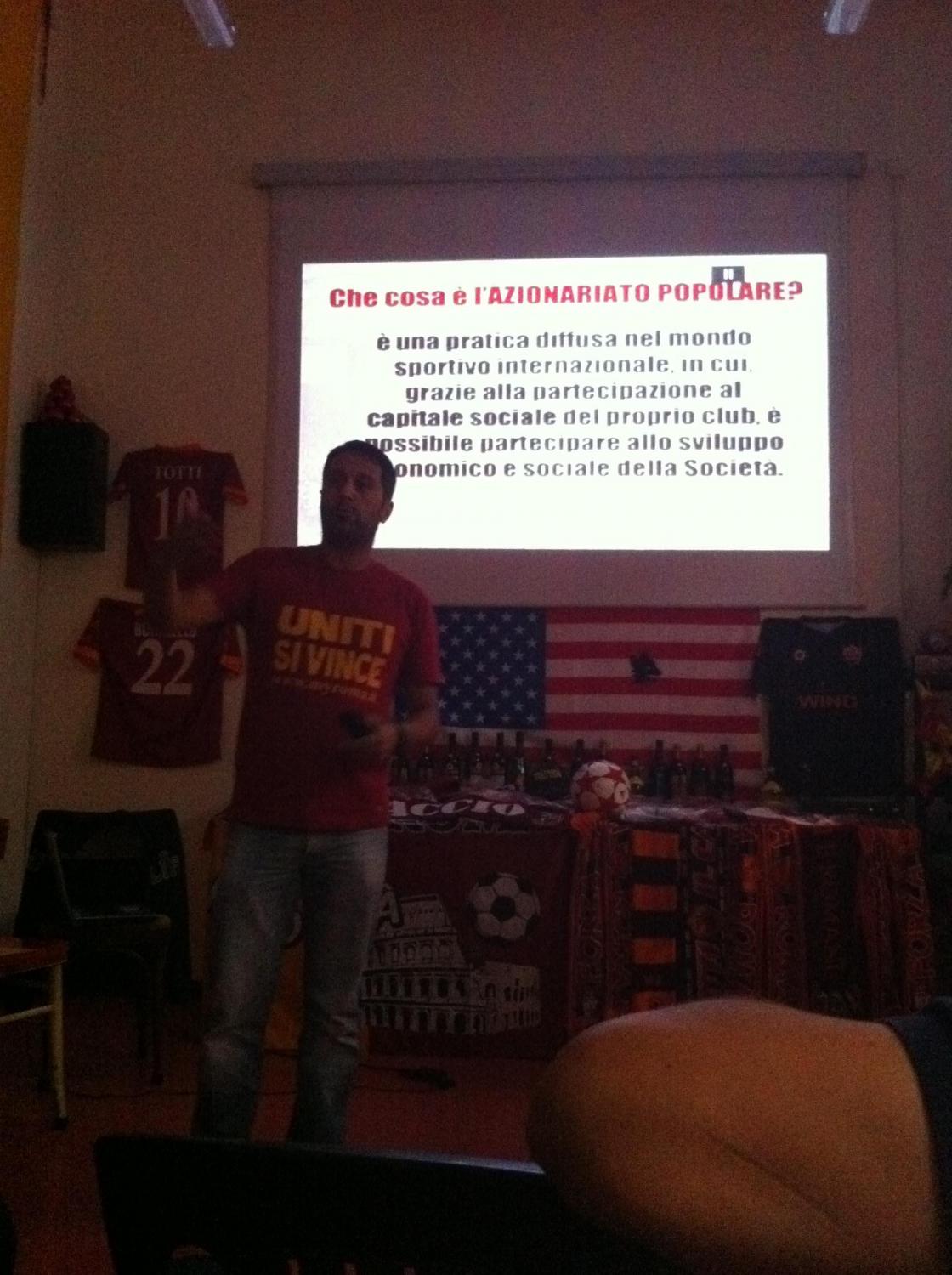 18.30 - Ha inizio l'assemblea. Si parla in generale dell'azionariato popolare raccontandone le origini e la storia. Da segnalare che un membro dell'associazione MyRoma è stato eletto per far parte dell'associazione Europea, per conto dell'azionariato, che comunica direttamente con il Parlamento europeo e con la Uefa. Presente tra i soci anche Massimo Ghini, membro di MyRoma e del Roma Club Testaccio.