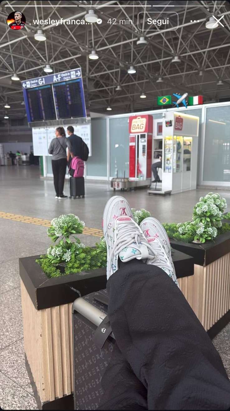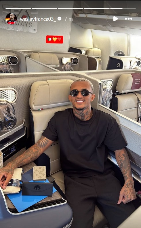 CALCIOMERCATO ROMA, WESLEY IN AEROPORTO - Tutto pronto per la partenza: il brasiliano, infatti, ha postato una storia sul proprio profilo Instagram mentre si trova in aeroporto, in attesa di salire sull'aereo che lo porterà a Roma. Con il tempo che passa Wesley ci tiene a tenere aggiornati i tifosi giallorossi e infatti ha postato un'altra storia sul suo profilo Instagram che lo ritrae seduto in aereo pronto a partire.