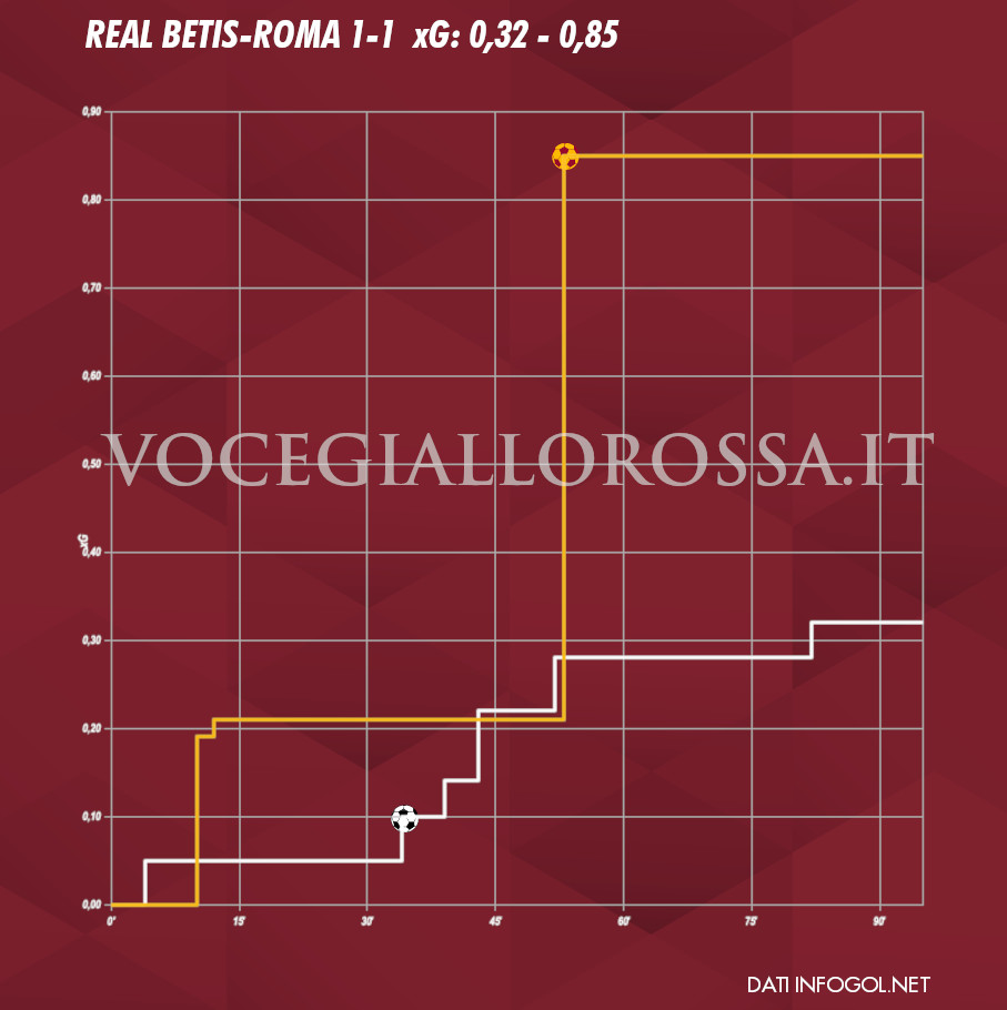 SFORTUNA ED ERRORI - Come spesso è accaduto, la Roma ha fornito una ottima prova difensiva: 0,32 gli expected goals concessi, con appena 7 tiri nessuno dei quali ha toccato la soglia degli 0,10 xG. La rete di Canales arriva dal peggior tiro del Real Betis di tutta la gara, da 0,02 xG. Complessivamente, nelle due partite i giallorossi hanno subìto 3 gol da tiri per un totale di 0,10 xG, trenta volte tanto quanto concesso. Numeri raggiungibili solo con un mix di errori (andata) e sfortuna (ritorno, vista la deviazione).