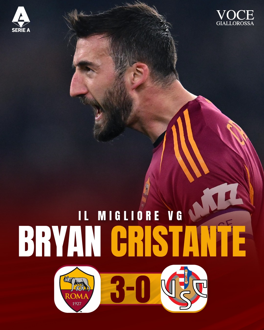 La Roma travolge 3-0 la Cremonese grazie alla super prestazione di Bryan Cristante che, prima sblocca il match di testa e poi serve l'assist con il tacco per il raddoppio di Ndicka. Proprio per questo motivo, il numero 4 giallorosso è stato quindi stato nominato #IlMiglioreVG dai nostri lettori attraverso le votazioni avvenute sui canali social di Vocegiallorossa.it. Per Cristante si tratta del secondo riconoscimento stagionale.