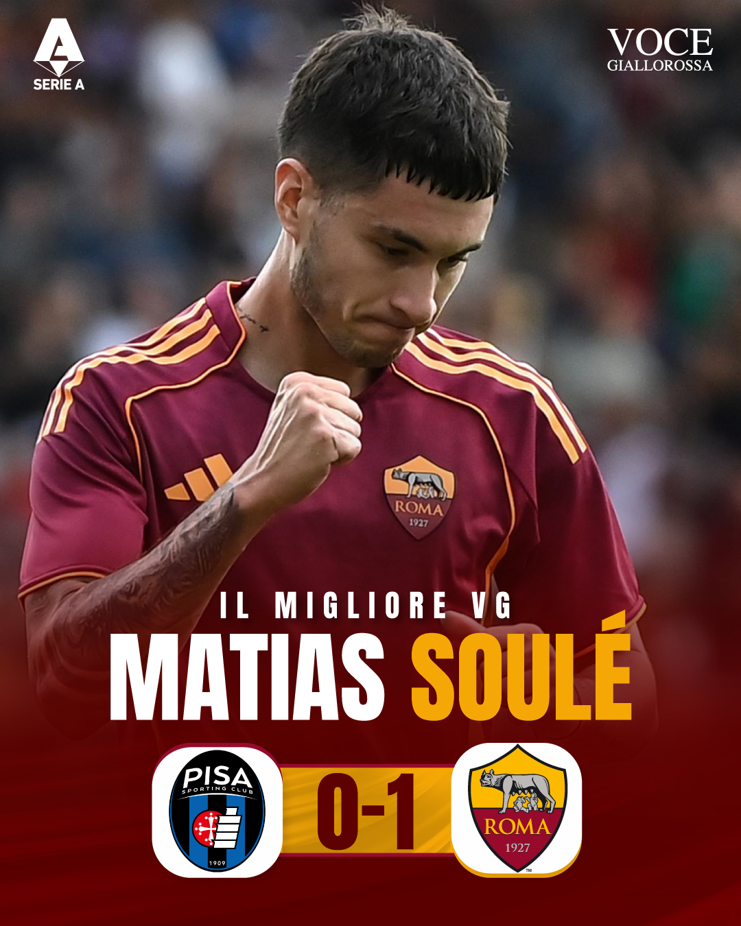 La Roma di Gasperini continua a vincere, ottenendo la seconda vittoria consecutiva. Dopo la gara contro il Bologna, infatti, i giallorossi battono anche il Pisa grazie al gol di Matías Soulé nella ripresa. Proprio il fantasista argentino è stato votato come #IlMiglioreVG del match attraverso i canali social di Vocegiallorossa.it: X, Instagram, Facebook e Threads.