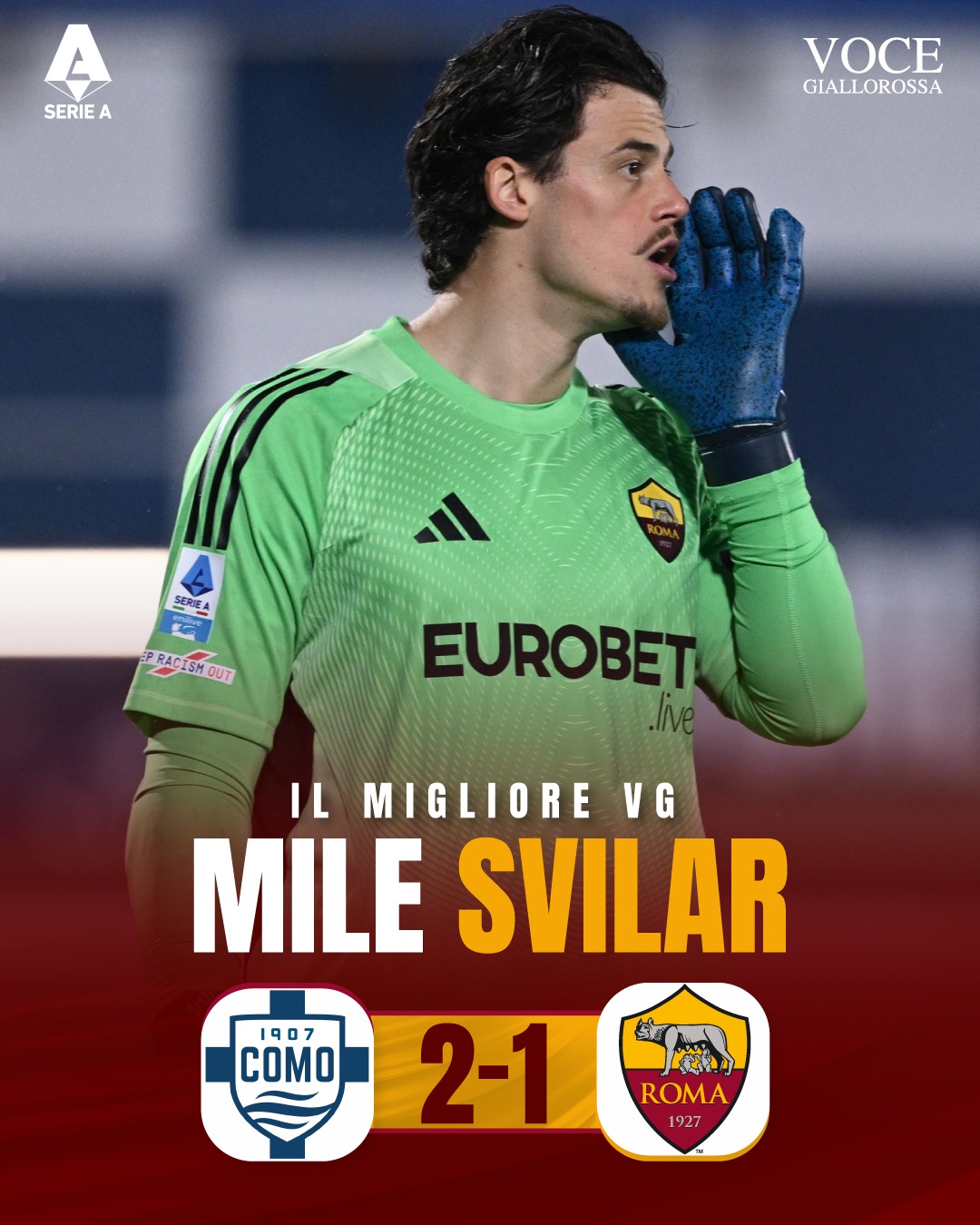 Brutta sconfitta per la Roma in casa del Como, tra prestazione deludente e secondo tempo ad handicap per l'ingiusta espulsione di Wesley. Una sconfitta di misura che avrebbe potuto avere un passivo maggiore se Mile Svilar non avesse compiuto numerose parate. Su tutte, quella con cui ha negato il gol a Nico Paz. È lui #IlMiglioreVG dai nostri lettori attraverso le votazioni avvenute sui canali social di Vocegiallorossa.it. Per Svilar, si tratta del decimo riconoscimento stagionale.