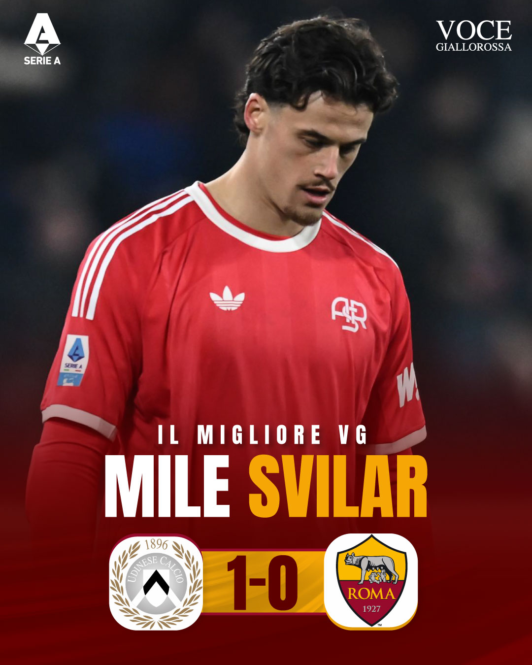 La Roma perde a Udine e lascia momentaneamente il 4° posto alla Juventus. I giallorossi cadono di misura contro i bianconeri, puniti dalla punizione deviata di Ekkelenkamp. Nonostante la sconfitta, il migliore in campo è stato ancora una volta Svilar, decisivo nel salvare il risultato. Il serbo è stato quindi stato nominato #IlMiglioreVG dai nostri lettori attraverso le votazioni avvenute sui canali social di Vocegiallorossa.it.