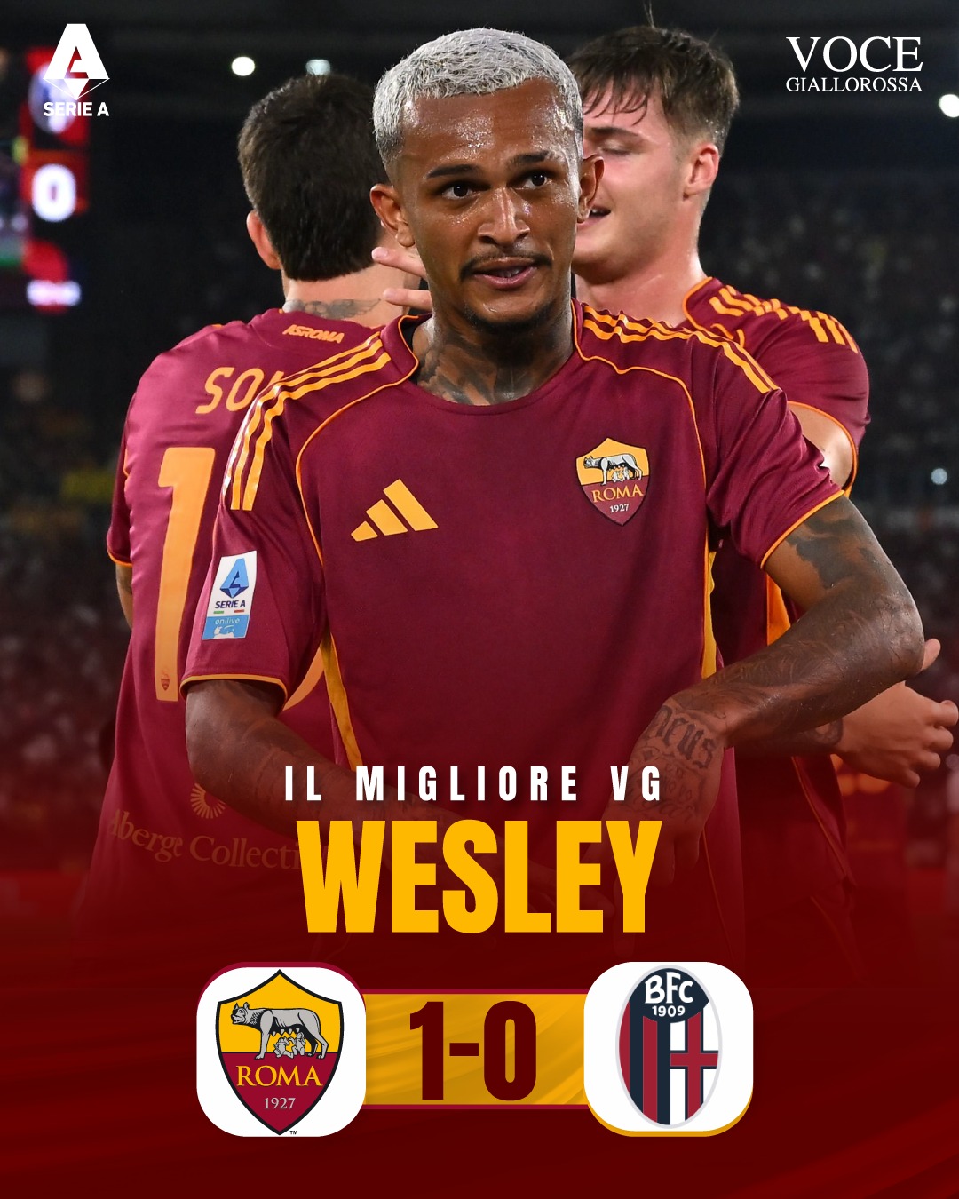 Buona la prima per la nuova Roma targata Gian Piero Gasperini, che all’esordio in campionato ha già conquistato i primi tre punti della Serie A 2025/2026 superando il Bologna di Vincenzo Italiano. Una vittoria di misura, arrivata al termine di una gara intensa e combattuta, che consente ai giallorossi di iniziare nel migliore dei modi la nuova stagione, davanti a un Olimpico vestito a festa. Tra le note più liete della serata spicca senza dubbio il debutto di Wesley. Il laterale brasiliano, arrivato in estate e subito lanciato da Gasperini dal primo minuto, ha ripagato la fiducia del tecnico siglando la rete decisiva nella seconda frazione di gioco, che ha consegnato i tre punti alla Roma. Un gol che ha subito fatto intravedere le qualità dell’ex Flamengo, capace di incidere non solo in fase di spinta ma anche di finalizzare al momento giusto. Proprio l'esterno destro brasiliano è stato votato ancora una volta come #IlMiglioreVG del match attraverso i canali social di Vocegiallorossa.it: X, Instagram, Facebook e Threads. Wesley è il primo calciatore della Roma a ricevere questo riconoscimento nella nuova stagione.