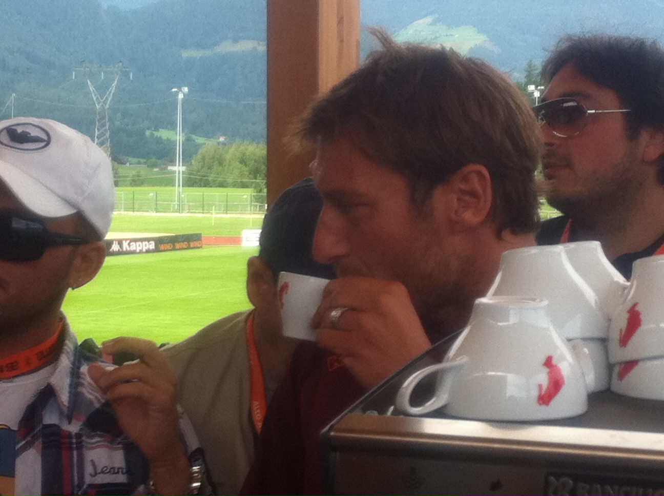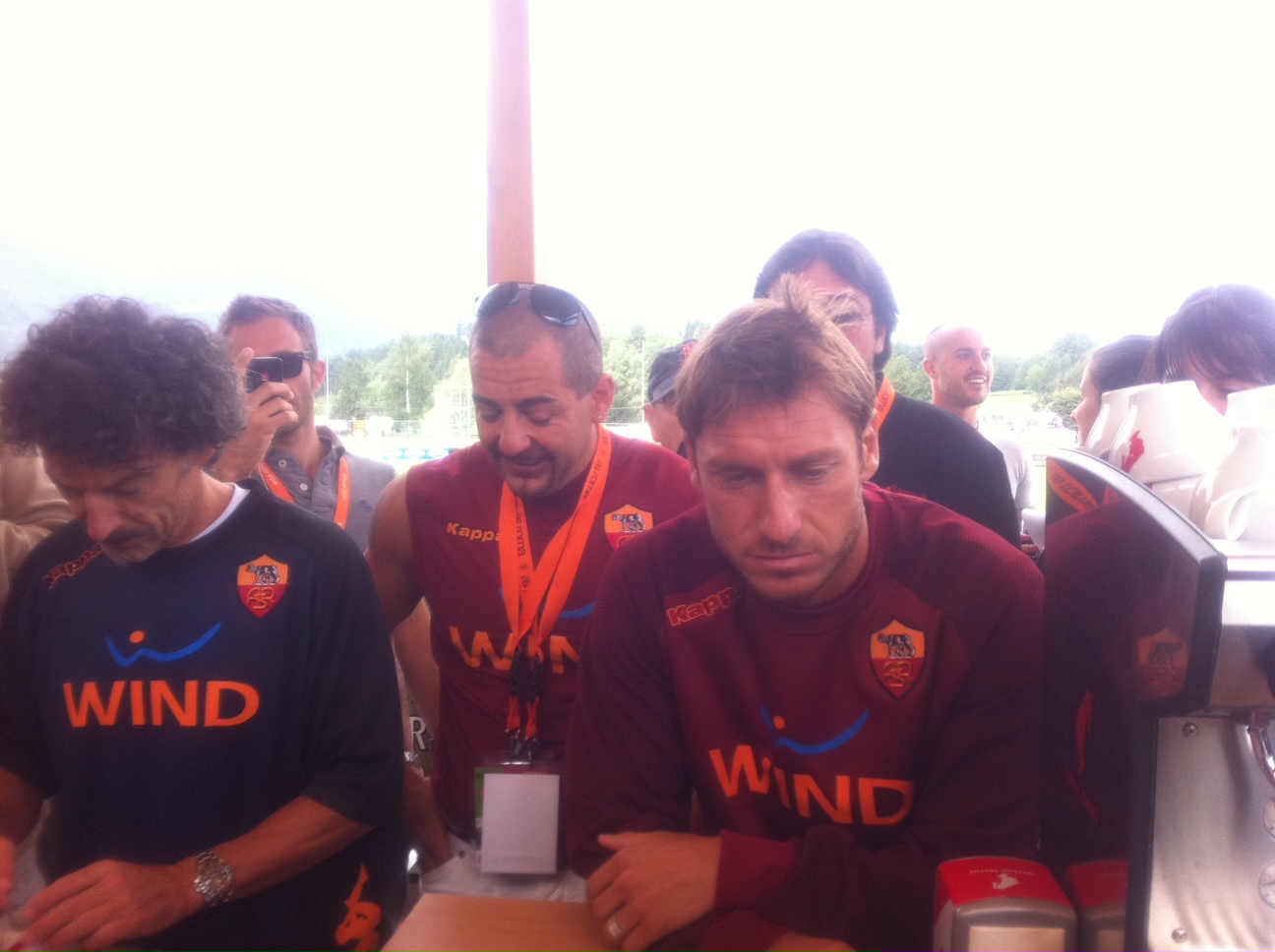 9.50 - Francesco Totti e Simone Perrotta si fermano a prendere un caffè in sala stampa, acclamati dai tifosi posti nelle vicinanze.