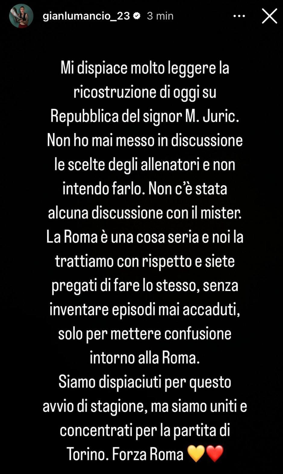 Stamattina, sul quotidiano La Repubblica, è stata rilanciata un'indiscrezione secondo cui, dopo il match Cagliari-Roma dello scorso 18 agosto, si sarebbe verificato un diverbio piuttosto acceso tra Daniele De Rossi e Gianluca Mancini, nato da un commento di quest'ultimo circa la scelta del mister di schierare titolare Zalewski al posto di Dybala. A negare l'accaduto, tuttavia, è proprio il difensore stesso, che pochi minuti fa ha pubblicato su Instagram una storia contenente solo una didascalia, che recita: "Mi dispiace molto leggere la ricostruzione di oggi su Repubblica del signor M.Juric. Non ho mai messo in discussione le scelte degli allenatori e non intendo farlo. Non c'è stata alcuna discussione con il mister. La Roma è una cosa seria e noi la trattiamo con rispetto e siete pregati di fare lo stesso, senza inventare episodi mai accaduti, solo per mettere confusione intorno alla Roma. Siamo dispiaciuti per questo avvio di stagione, ma siamo uniti e concentrati per la partita di Torino. Forza Roma". Il messaggio si conclude infine con due emoticon: un cuore giallo e uno rosso.