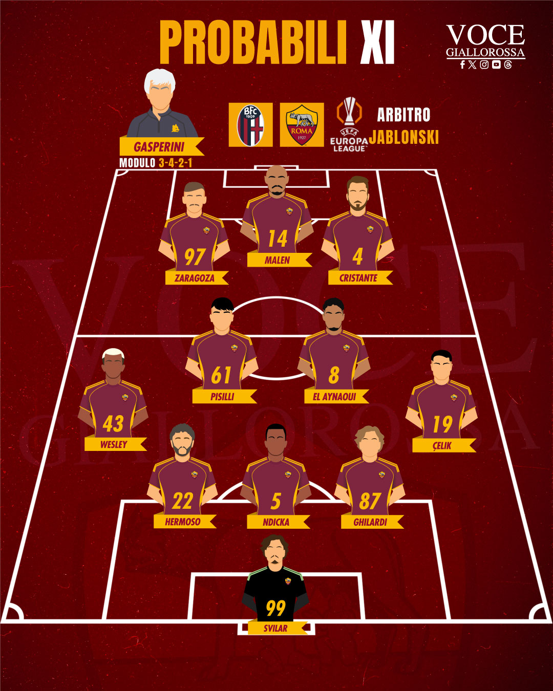 ROMA (3-4-2-1): Svilar; Ghilardi, Ndicka, Rensch; Celik, El Aynaoui, Pisilli, Wesley; Cristante, Zaragoza; Malen.