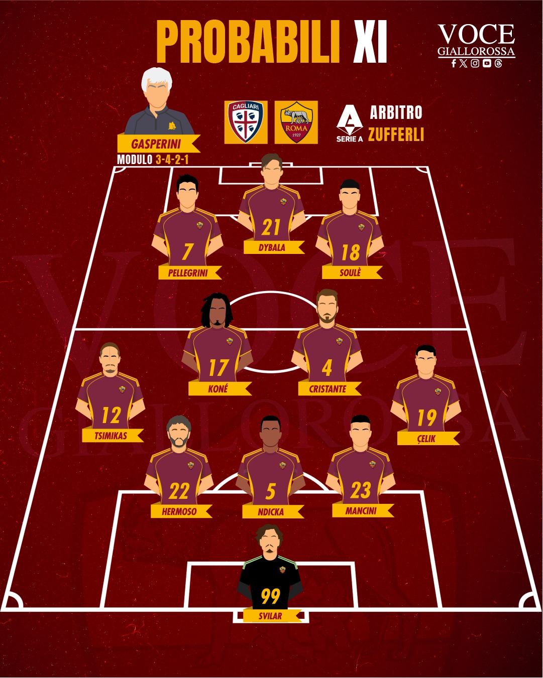 ROMA (3-4-2-1): Svilar; Mancini, Ndicka, Hermoso; Celik, Cristante, Koné, Tsimikas; Soulé, Pellegrini; Dybala.
