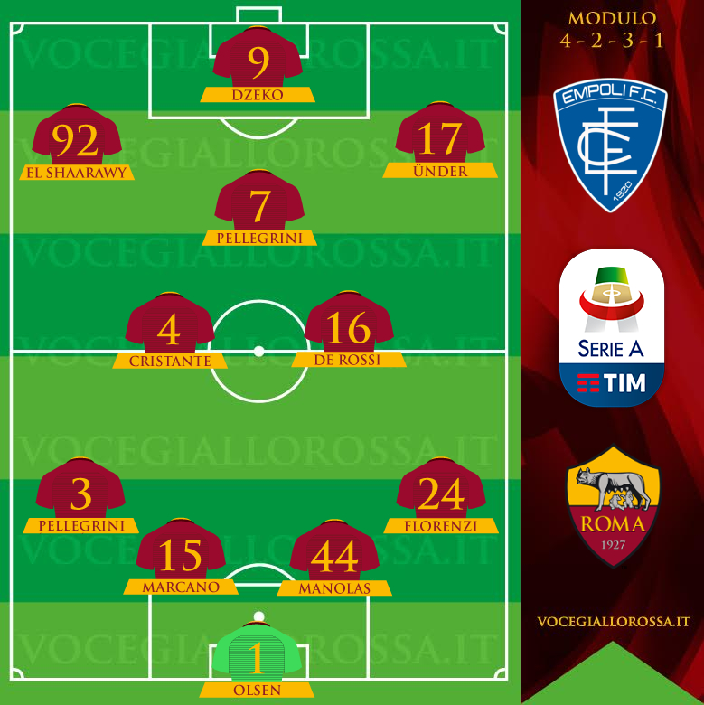 Roma (4-2-3-1): Olsen; Florenzi, Manolas, Marcano, Lu. Pellegrini; Cristante, De Rossi; Ünder, Pellegrini, El Shaarawy; Dzeko.