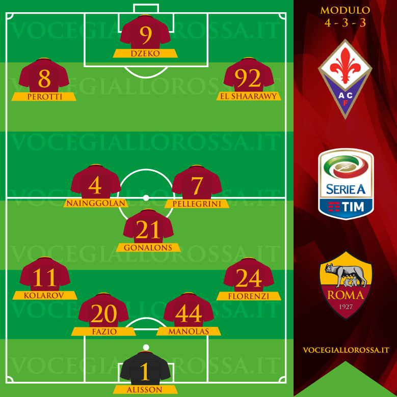 Archiviata l'entusiasmante vittoria contro il Chelsea, la Roma è attesa dalla difficile trasferta di Firenze. Di Francesco può sorridere perché Emerson torna tra i convocati dopo il lungo stop dovuto alla lesione del crociato del ginocchio. In difesa tornerà Manolas, che potrebbe prendere posto accanto a Fazio. Florenzi è recuperato e giocherà a destra con Kolarov a sinistra. A centrocampo, Gonalons prenderà il posto di De Rossi mentre Pellegrini agirà al posto di Strootman. Confermato Nainggolan, con Perotti, El Shaarawy e Dzeko a guidare l'attacco giallorosso.