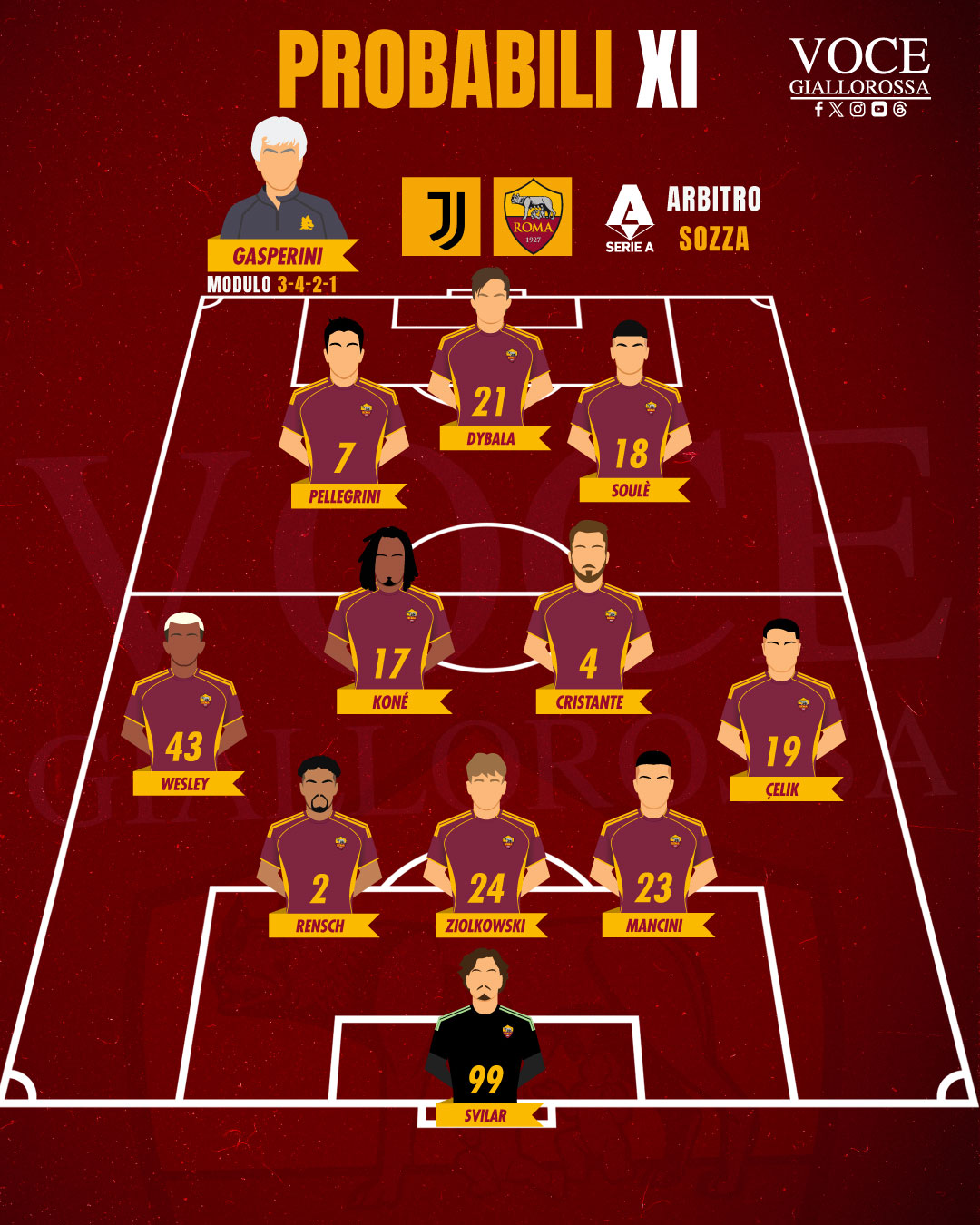 ROMA (3-4-2-1): Svilar; Mancini, Ziolkowski, Rensch; Celik, Cristante, Koné, Wesley; Soulé, Pellegrini; Dybala.