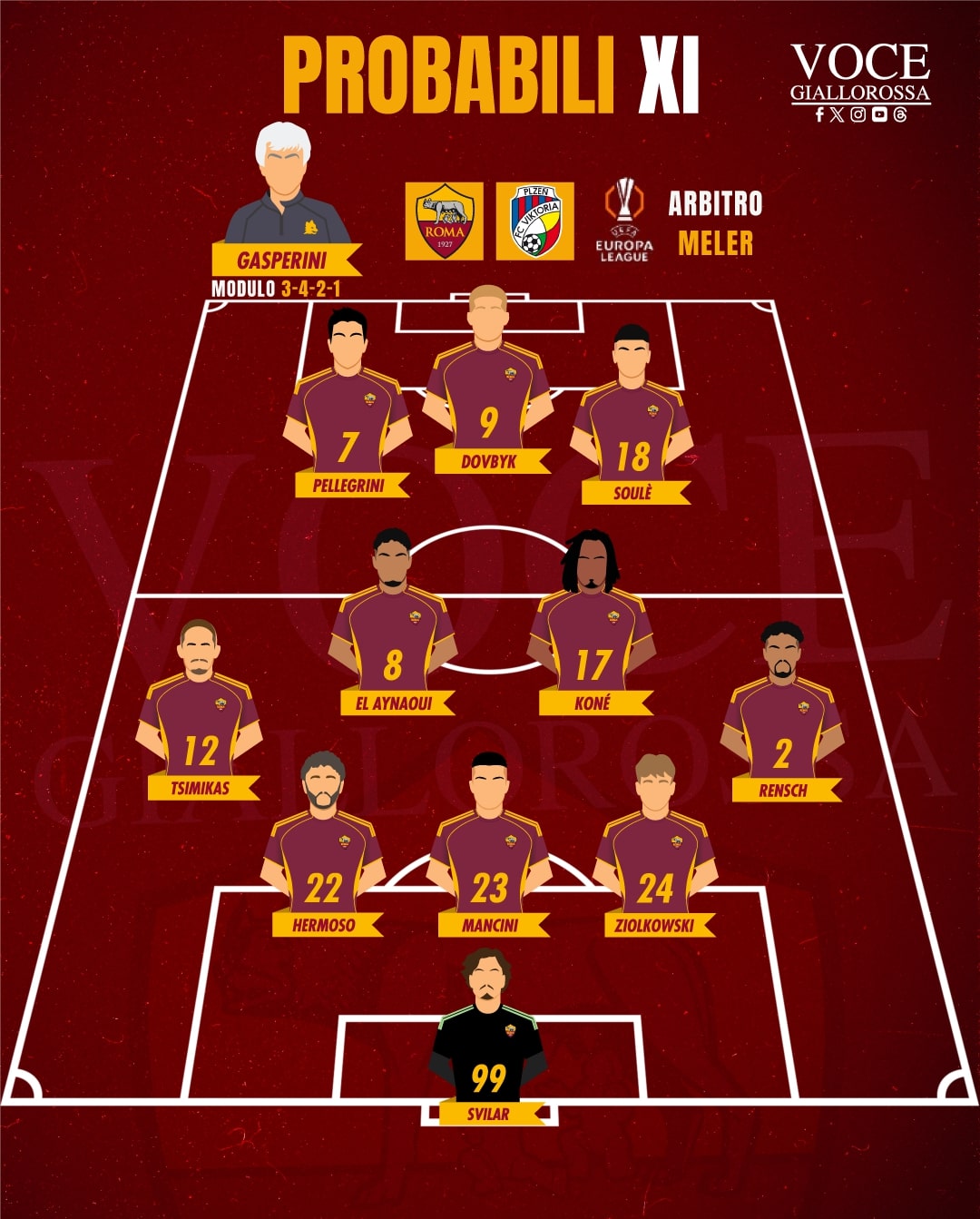 ROMA (3-4-2-1): Svilar; Ziolkowski, Mancini, Hermoso; Rensch, Koné, El Aynaoui, Tsimikas; Soulé, Pellegrini; Dovbyk.
