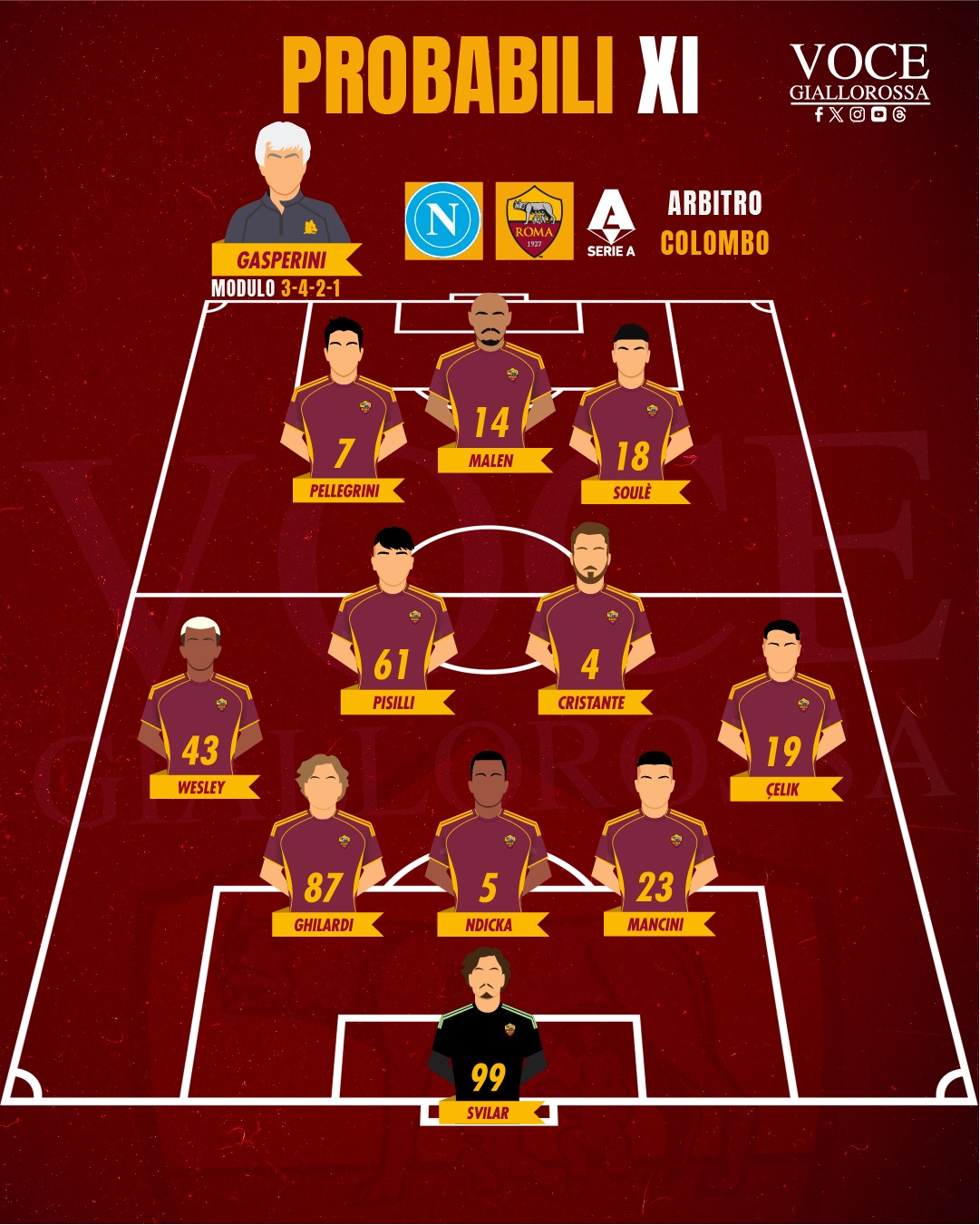 LE PROBABILI FORMAZIONI DI NAPOLI-ROMA: LE SCELTE DI GASPERINI - Solito 3-4-2-1 per Gian Piero Gasperini con Svilar regolarmente tra i pali. A difendere l’estremo difensore serbo ci sarà il terzetto formato da Mancini, Ndicka e Ghilardi, con Hermoso che scalpita per recuperare dalla contusione al piede. In mediana conferma per la coppia Cristante-Pisilli, con Celik sulla fascia destra e Wesley impiegato a tutta fascia. In avanti Malen sarà il terminale offensivo, supportato da Soulé (pubalgia permettendo) e Pellegrini. Se l'ex Juventus dovesse partire dalla panchina, giocherebbe Zaragoza dall'inizio.