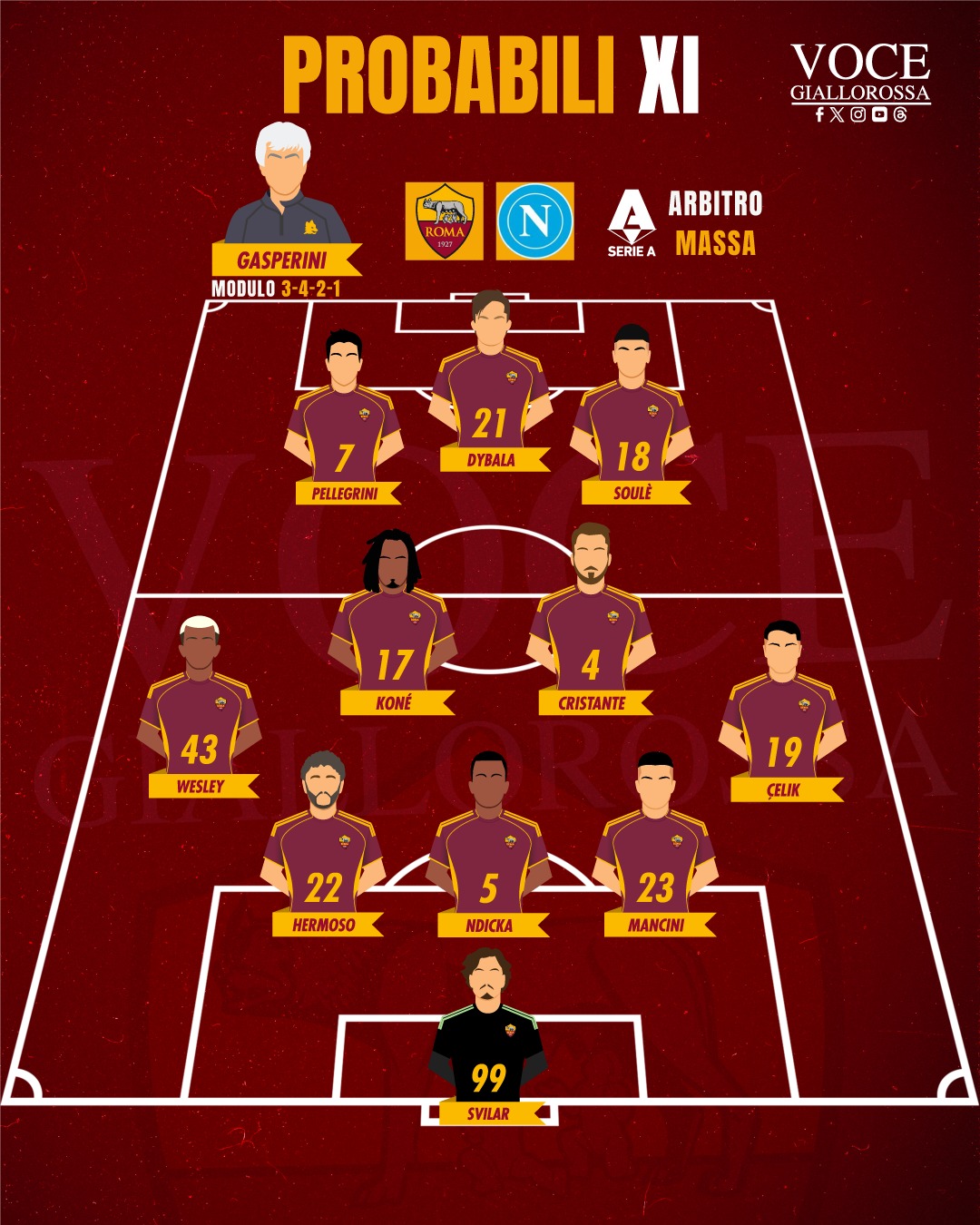 ROMA (3-4-2-1): Svilar; Mancini, Ndicka, Hermoso; Celik, Cristante, Koné, Wesley; Soulé, Pellegrini; Dybala.