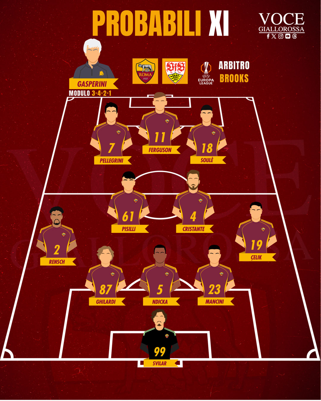 ROMA (3-4-2-1): Svilar; Celik, Ziolkowski, Ghilardi; Rensch, Koné, Pisilli, Tsimikas; Soulé, Pellegrini; Ferguson.