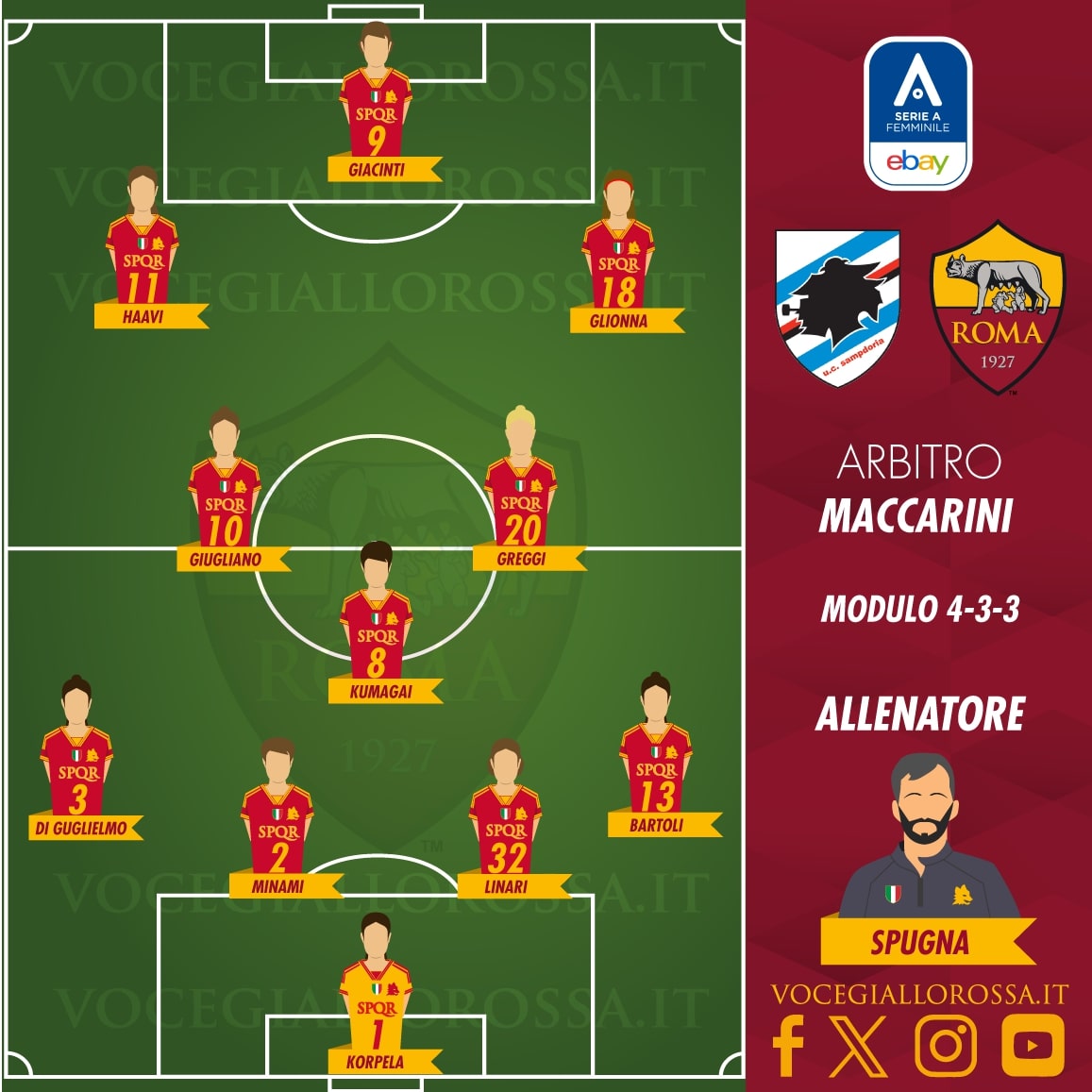 Domenica alle ore 17:00 la Roma Femminile affronterà la Sampdoria nell'ultima sfida prima della pausa delle Nazionali. Come anticipato già nell'intervista alla vigilia, mister Spugna ha come obiettivo quello di arrivare alla sosta con il punteggio pieno. Per questo, non si affiderà ad un vero e proprio turnover: Korpela tra i pali, con al centro della difesa le solite Linari e Minami. A destra dovrebbe tornare capitan Bartoli dal primo minuto e a sinistra Di Guglielmo e Aigbogun si contenderanno un posto da titolare. A centrocampo le titolarissime Greggi, Kumagai e Giugliano, mentre il trio d'attacco sarà composto da Glionna, Giacinti e Haavi.