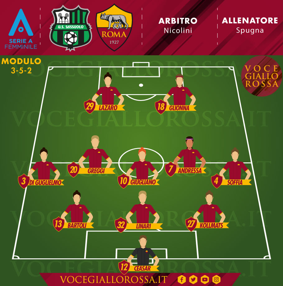Roma (3-5-2): Ceasar; Kollmats, Linari, Bartoli; Soffia, Andressa, Giugliano, Greggi, Di Guglielmo; Glionna, Lazaro. All. Spugna