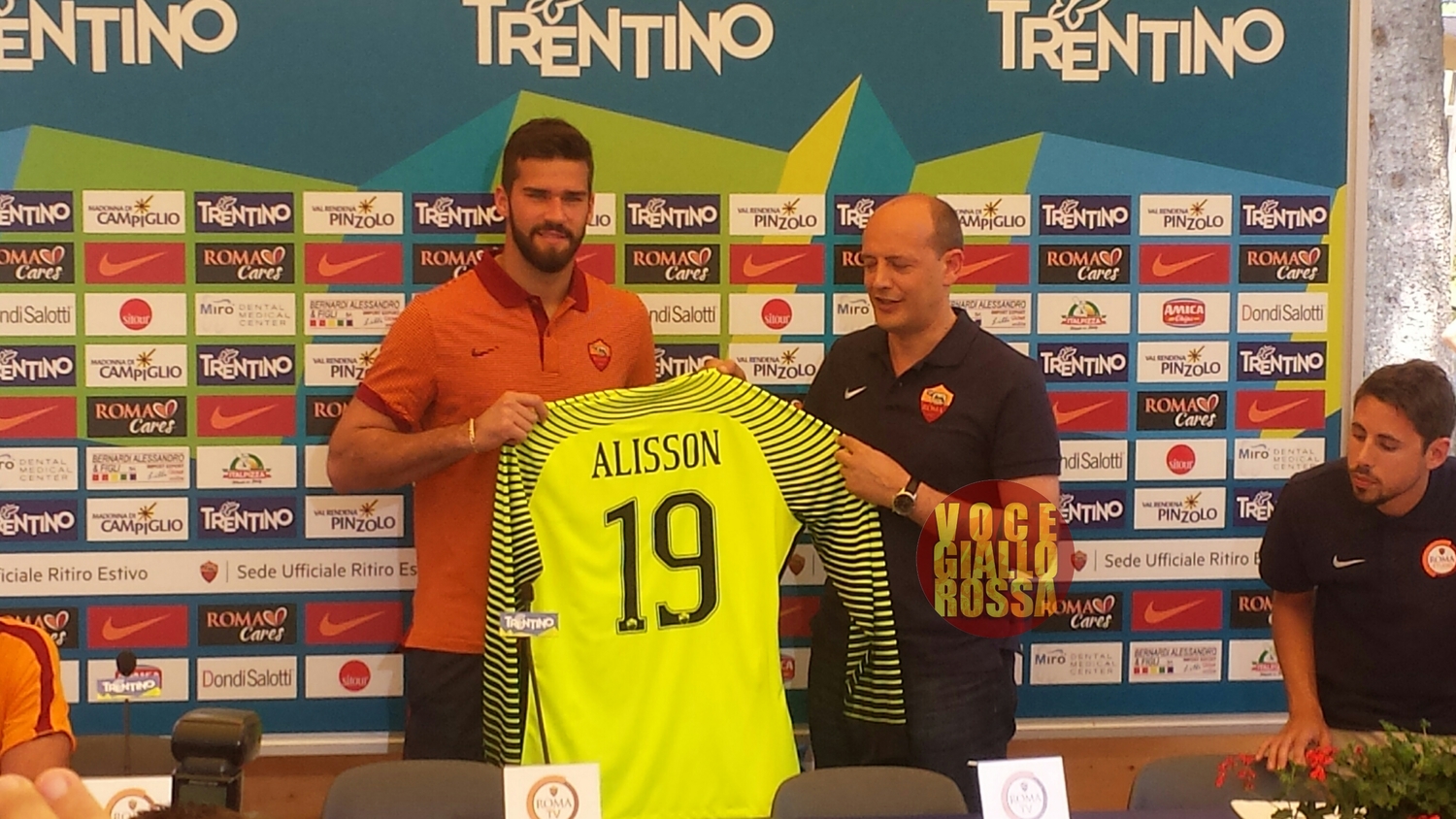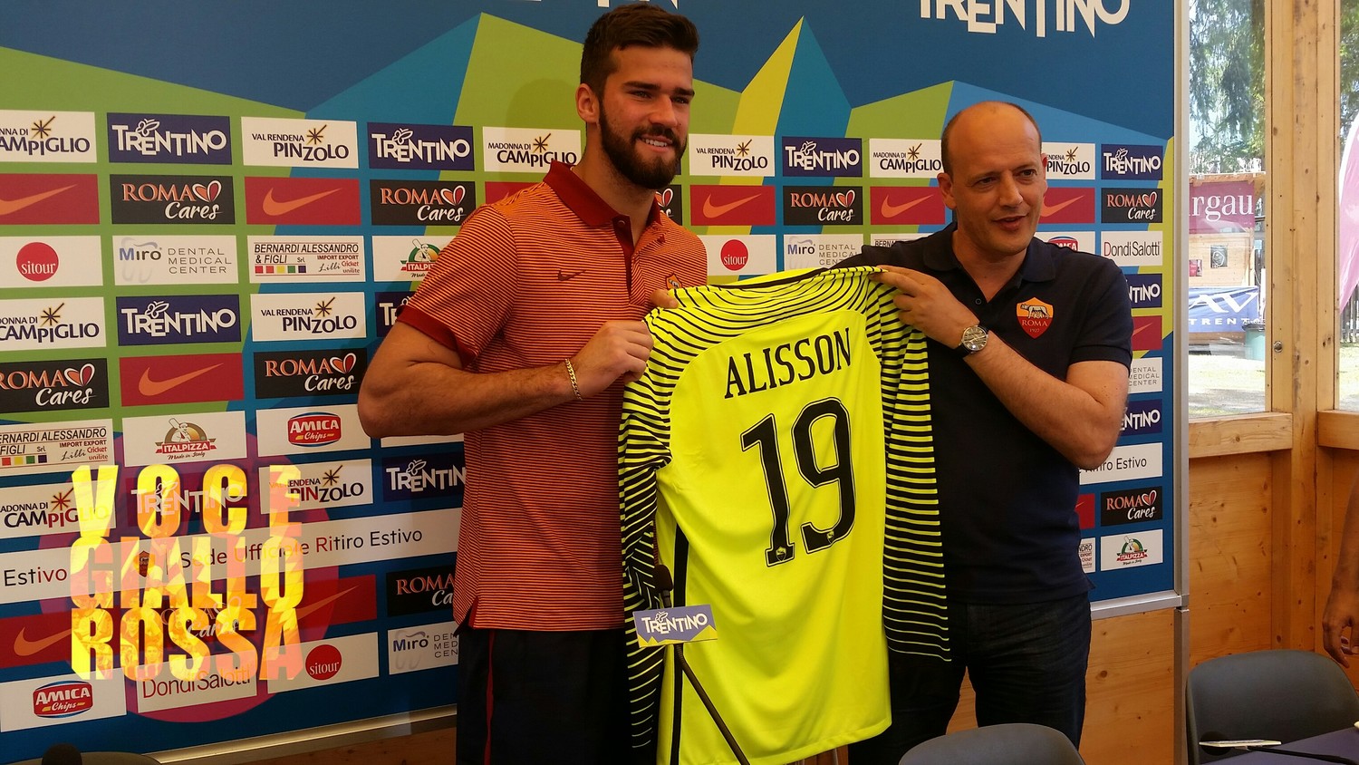 Prende la parola Mauro Baldissoni: "Buongiorno e ben ritrovati. Diamo il benvenuto ad Alisson, un altro brasiliano, abbiamo studiato la pronuncia perfetta. È molto giovane ma già ha 108 presenze con l'Internacional e 9 con il Brasile di cui ha difeso la porta in Copa America. La Roma ha già comprato un giocatore da quel club, ovvero Falcao, non possiamo che augurargli la stessa strada di successi con Falcao".