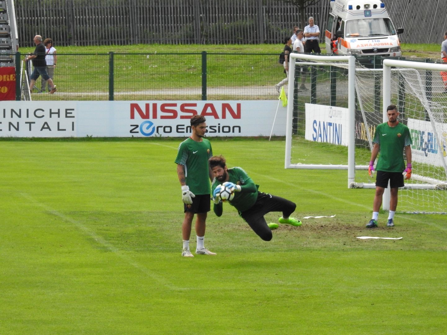 18.20 - Savorani, il preparatore dei portieri della Roma, mette con le mani la palla sotto la traversa e loro devo correre all'indietro e smanacciarla. Si parte da un palo, corsa verso l'altro, Savorani tira in controtempo e c'è il tuffo. Ogni portiere deve respingere 5 tiri per volta.