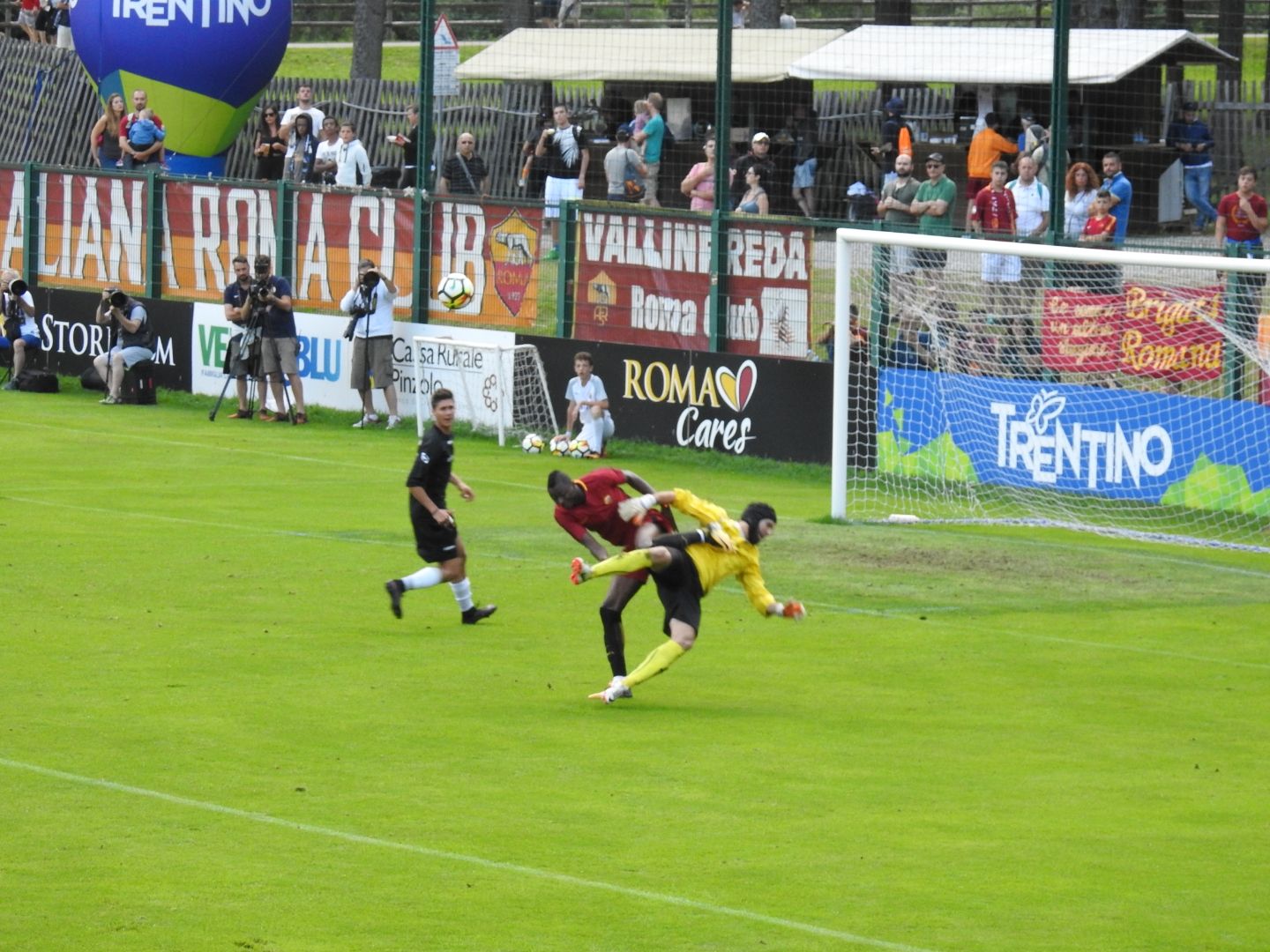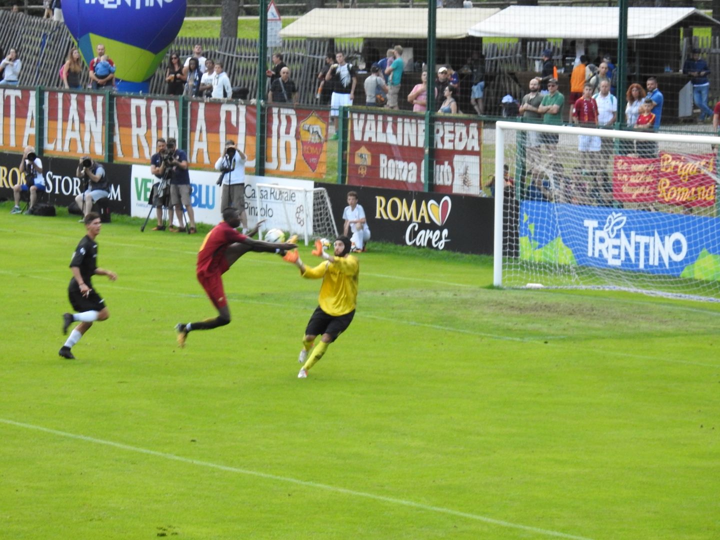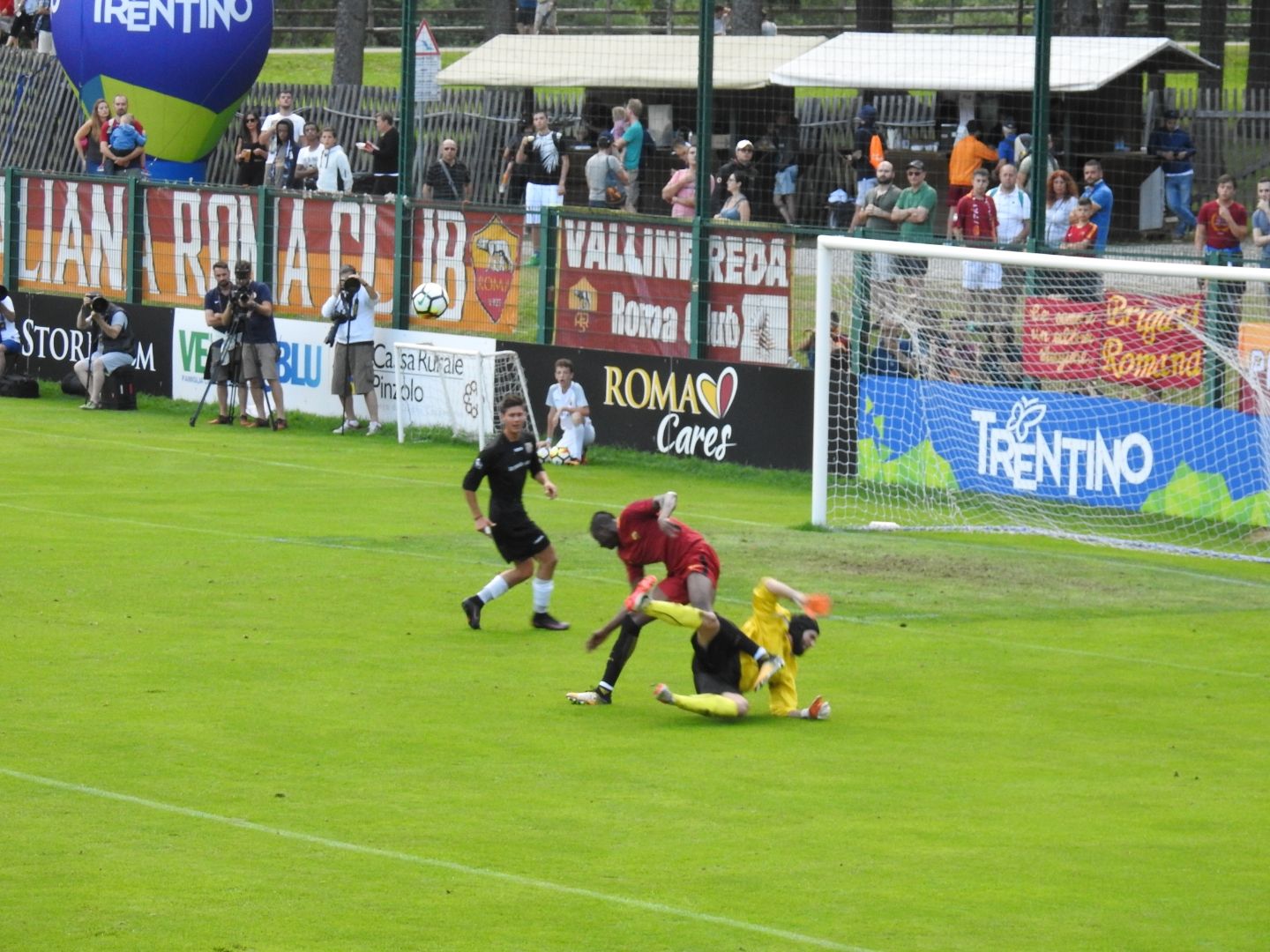 Nel corso del secondo tempo dell'amichevole tra Pinzolo Campiglio e Roma, c'è stato uno scontro tra Sadiq e il portiere di casa Cereghini. Ecco le immagini.