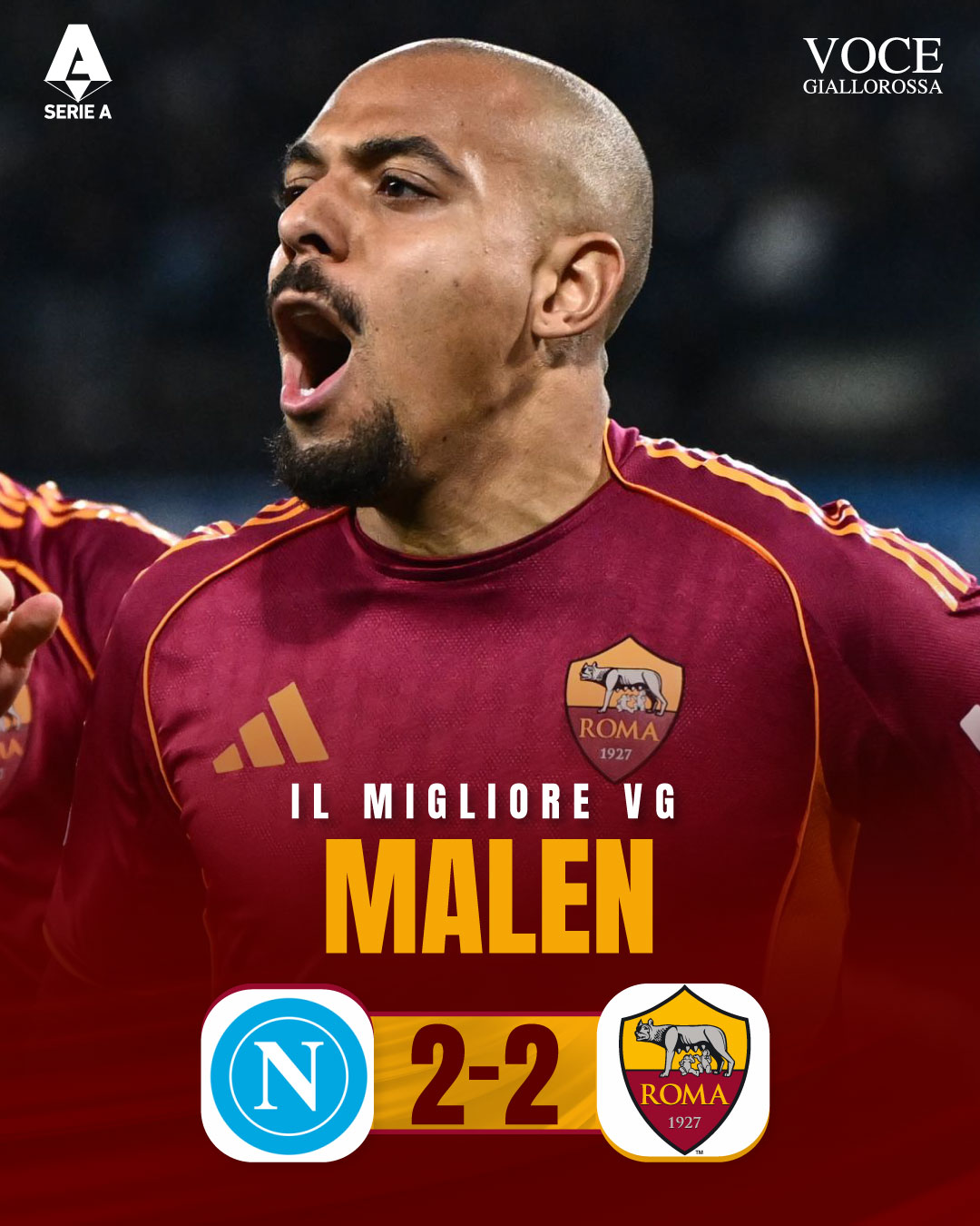 La Roma impatta 2-2 contro il Napoli nonostante la doppietta Doneyll Malen, che sta avendo un impatto devastante nella Capitale. Proprio per questo motivo, l'olandese è stato quindi stato nominato #IlMiglioreVG dai nostri lettori attraverso le votazioni avvenute sui canali social di Vocegiallorossa.it. Per Malen si tratta del terzo riconoscimento stagionale.