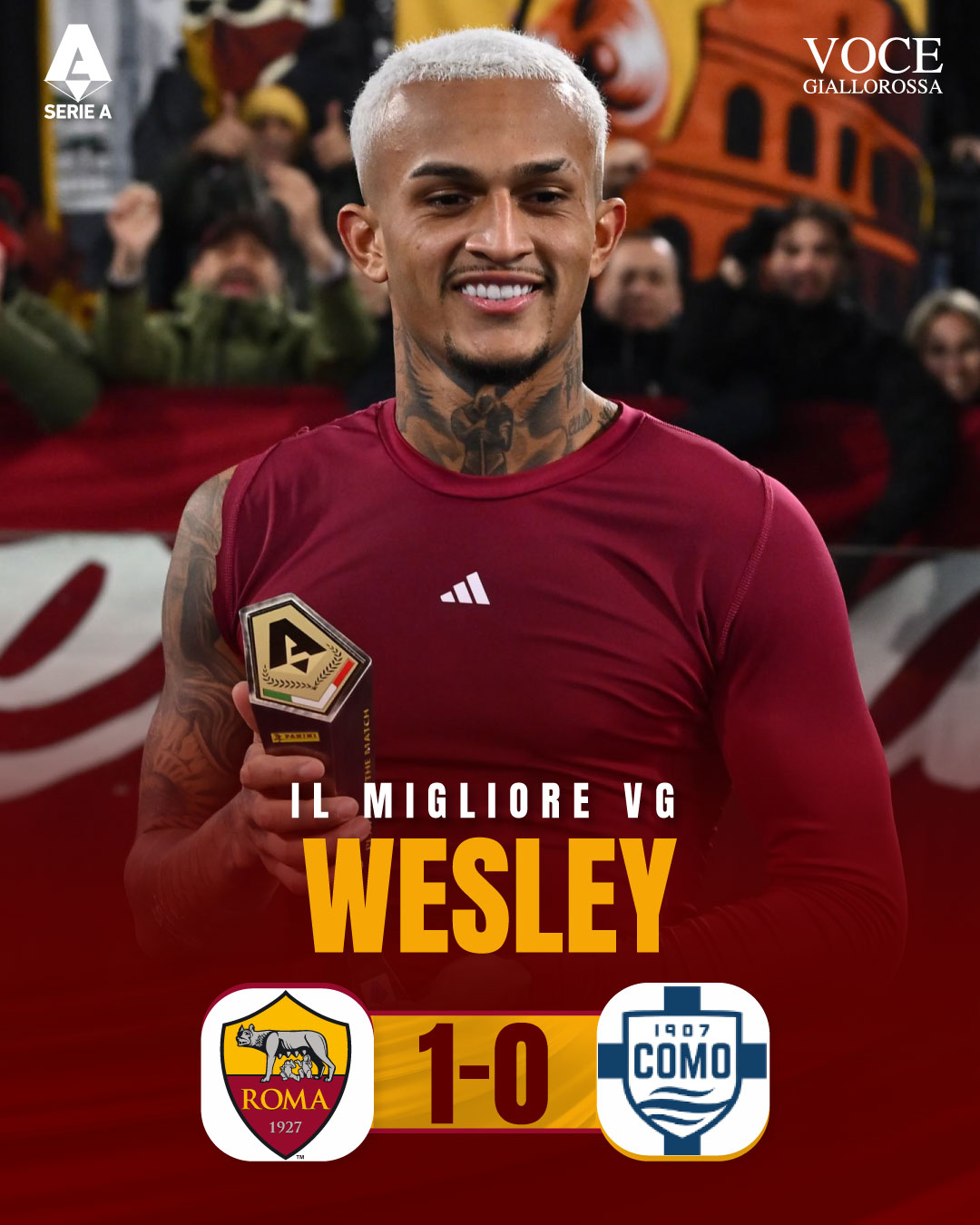 La Roma ha battuto il Como con merito grazie al gol di Wesley nella ripresa. Il brasiliano è tornato per l'occasione sulla fascia destra, la sua di competenza, da dove è penetrato in area per scagliare il diagonale che ha regalato i tre punti alla Roma. Il calciatore è stato così eletto #IlMiglioreVG del match attraverso i canali social di Vocegiallorossa.it: X, Instagram, Facebook e Threads. Per Wesley si tratta del terzo riconoscimento stagionale.