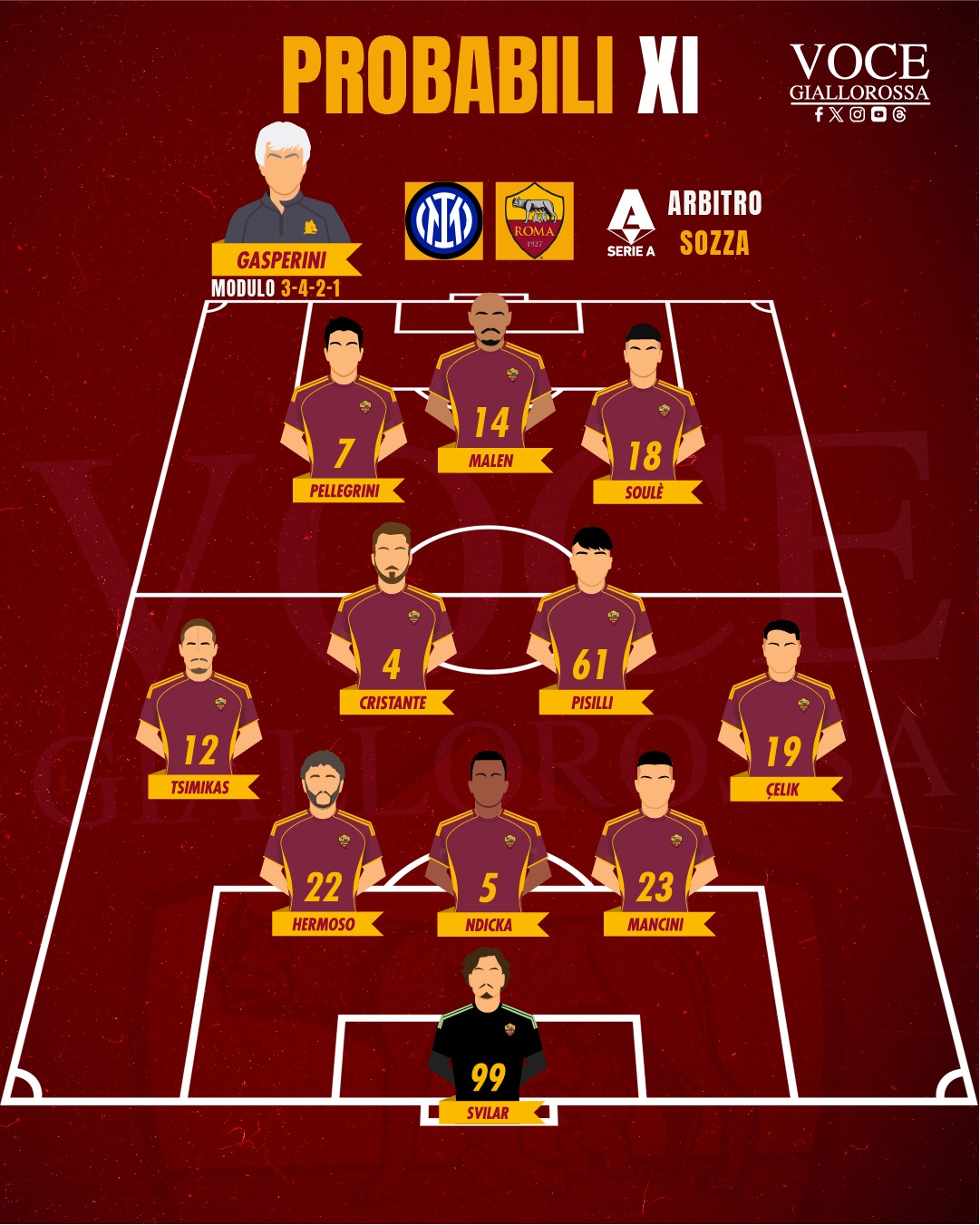 ROMA (3-4-2-1): Svilar; Mancini, Ndicka, Hermoso; Celik, Pisilli, Cristante, Tsimikas; Soulé, Pellegrini; Malen.