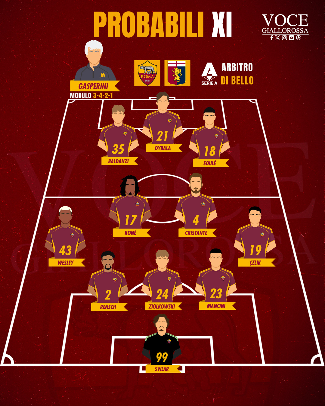 ROMA (3-4-2-1): Svilar; Mancini, Ziolkowski, Rensch; Celik, Cristante, Koné, Wesley; Soulé, El Shaarawy; Dybala.