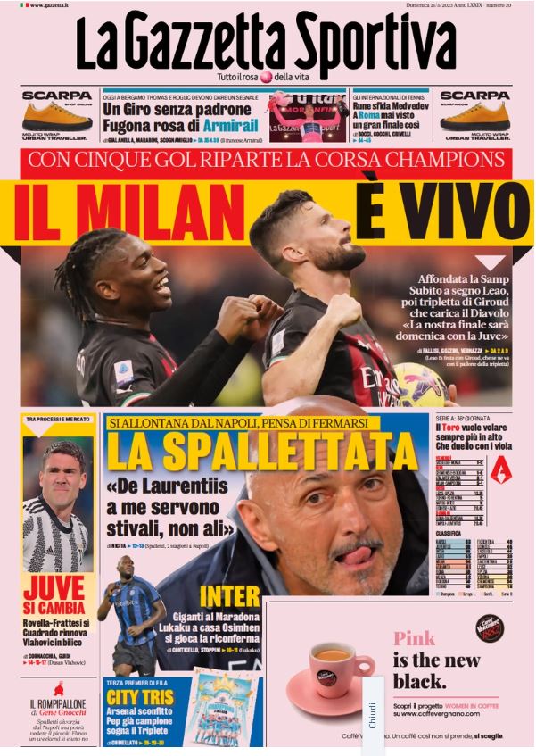 Come sarà la Juventus del prossimo anno? Diversa, risponderebbe La Gazzetta dello Sport. Già in prima pagina il quotidiano rosa si sofferma sui possibili cambiamenti dei bianconeri in vista della prossima stagione: "Juve, si cambia. Rovella-Frattesi sì, Cuadrado rinnova, Vlahovic in bilico".