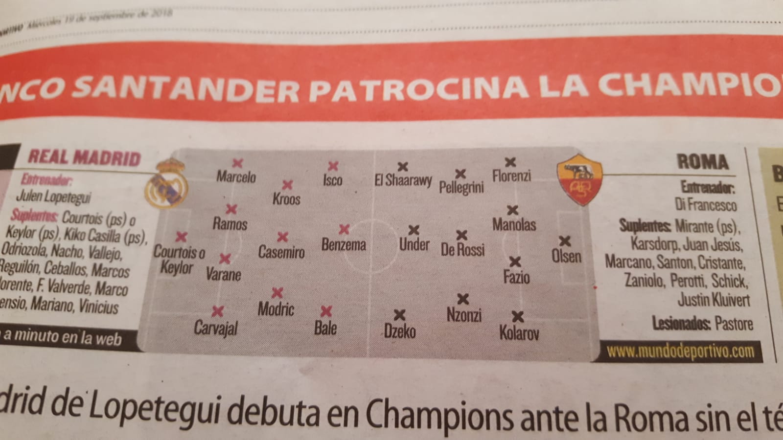 Non ha dubbi il Mundo Deportivo in edicola oggi sui 10 giocatori di movimento del Real Madrid che scenderanno in campo questa sera al Bernabeu contro la Roma, con Isco nel tridente d'attacco con Benzema e Bale e Modric regolarmente a centrocampo: l'unico dubbio verte sul portiere, con Navas e Courtois in ballottaggio. La Roma viene schierata col 4-3-3 con Nzonzi mezzala e il tridente Ünder-Dzeko-El Shaarawy (pur posizionati in modo errato nella grafica proposta).