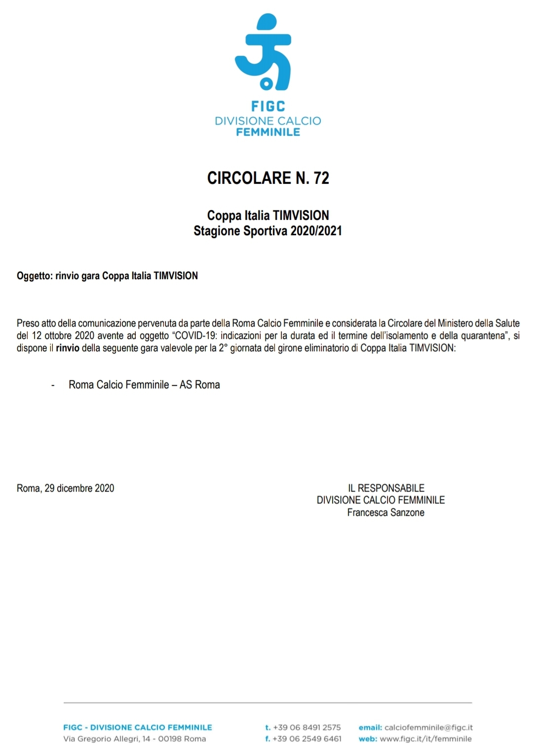 La FIGC Divisione Calcio Femminile, tramite il proprio sito ufficiale (figc.it/it/femminile), ha pubblicato quest'oggi, martedì 29 dicembre, la Circolare N. 72 nella quale comunica il rinvio a data da destinarsi di Roma Calcio Femminile-AS Roma, valevole per la 2ª giornata del girone eliminatorio della Coppa Italia TIMVISION 2020/2021, a causa del prolungarsi dell'emergenza epidemiologica legata al COVID-19.