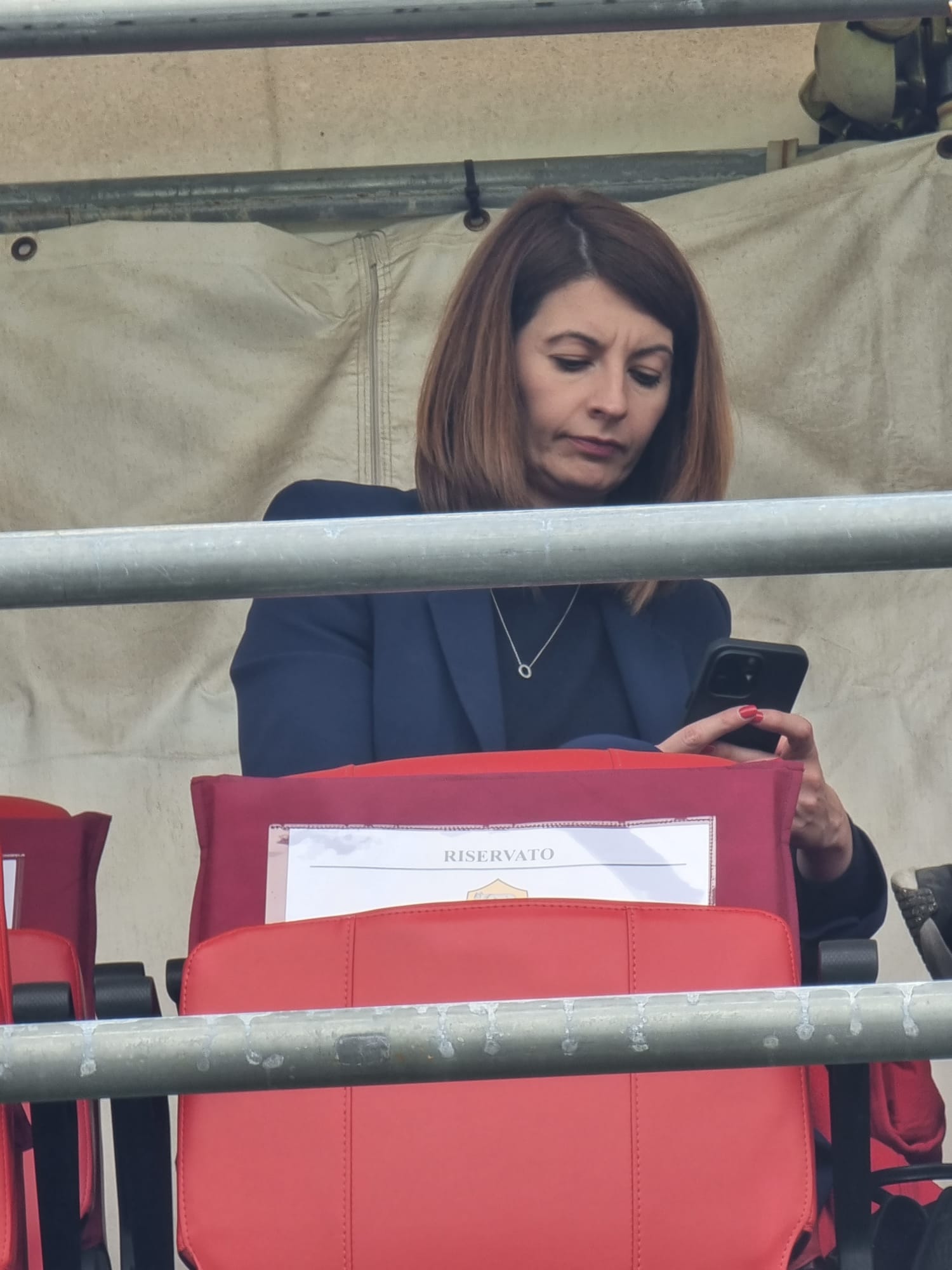 La Roma Femminile sta pareggiando 0-0 contro l'Inter nell'ultima gara casalinga della stagione, con le giallorosse che saranno premiate a fine partita per la vittoria del campionato. Presente in tribuna al "Tre Fontane" c'è anche il CEO capitolino Lina Souloukou come mostrato dallo scatto raccolto da Vocegiallorossa.it!