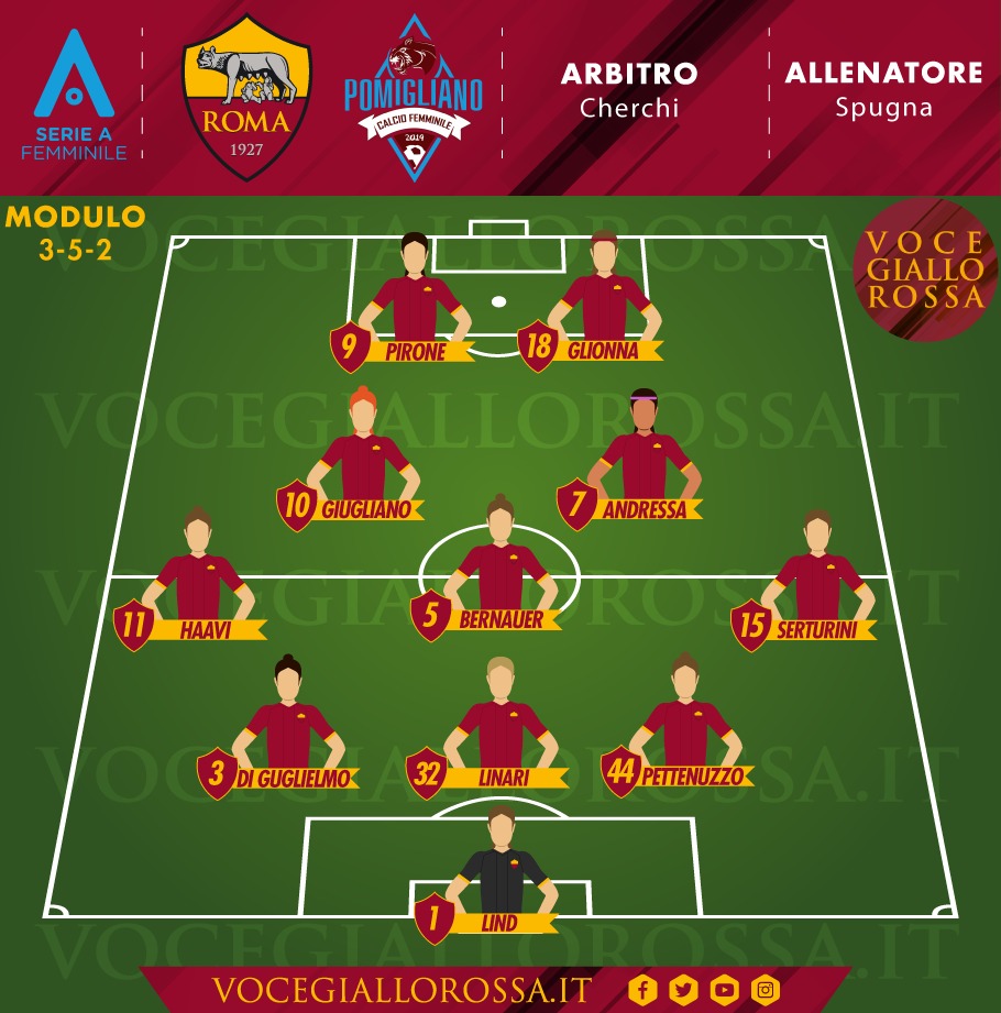 Dopo la vittoria ottenuta in Coppa Italia, la Roma Femminile torna a giocare in campionato. La squadra di Spugna ospita il Pomigliano, che attualmente occupa la settima posizione in classifica. Le giallorosse, invece, sono seconde e devono continuare a vincere per provare a staccare il Sassuolo - secondo a pari punti - e le altre inseguitrici. Per la sfida con il Pomigliano, Spugna recupera due pedine fondamentali: Giugliano e Pirone.