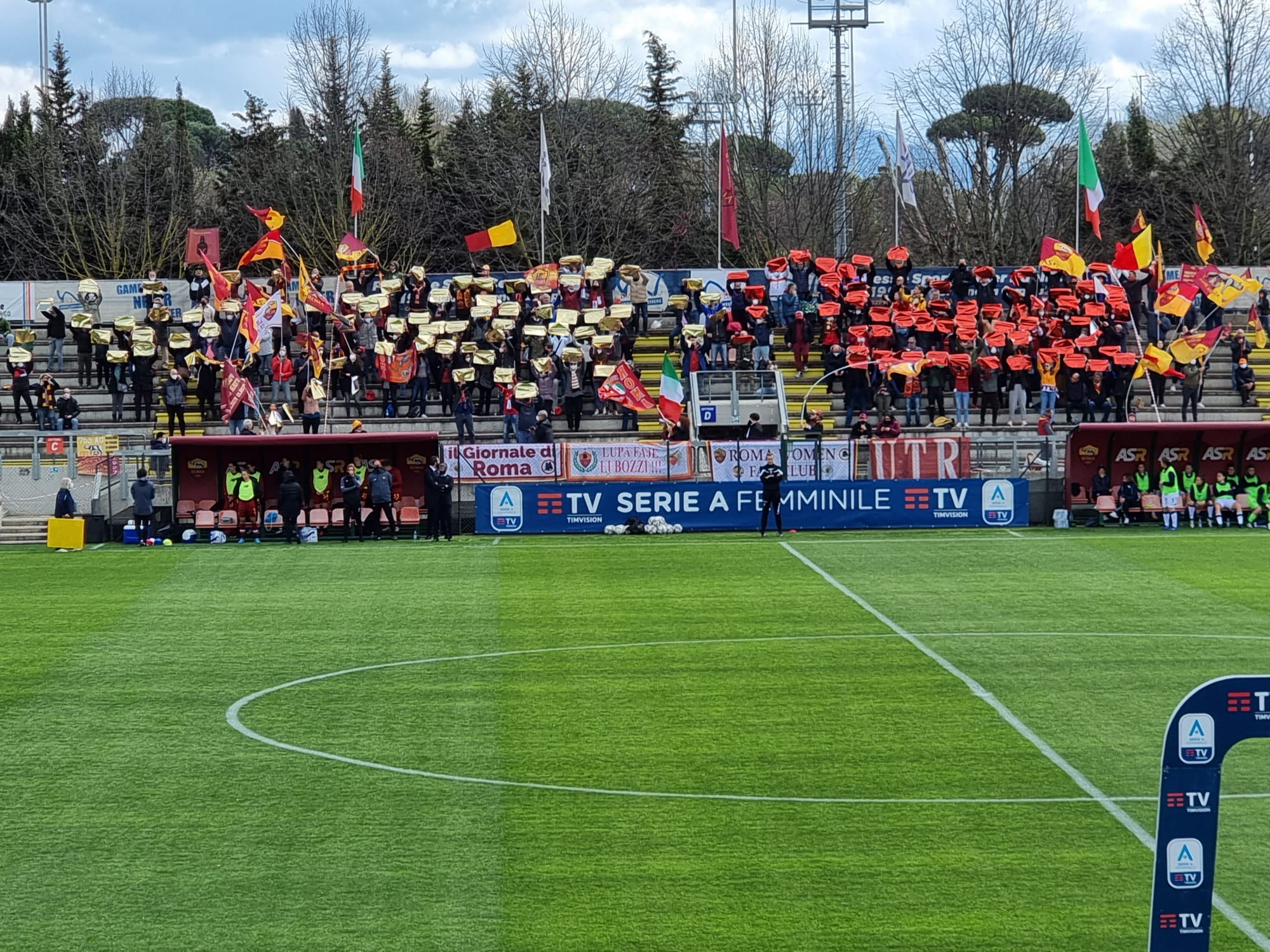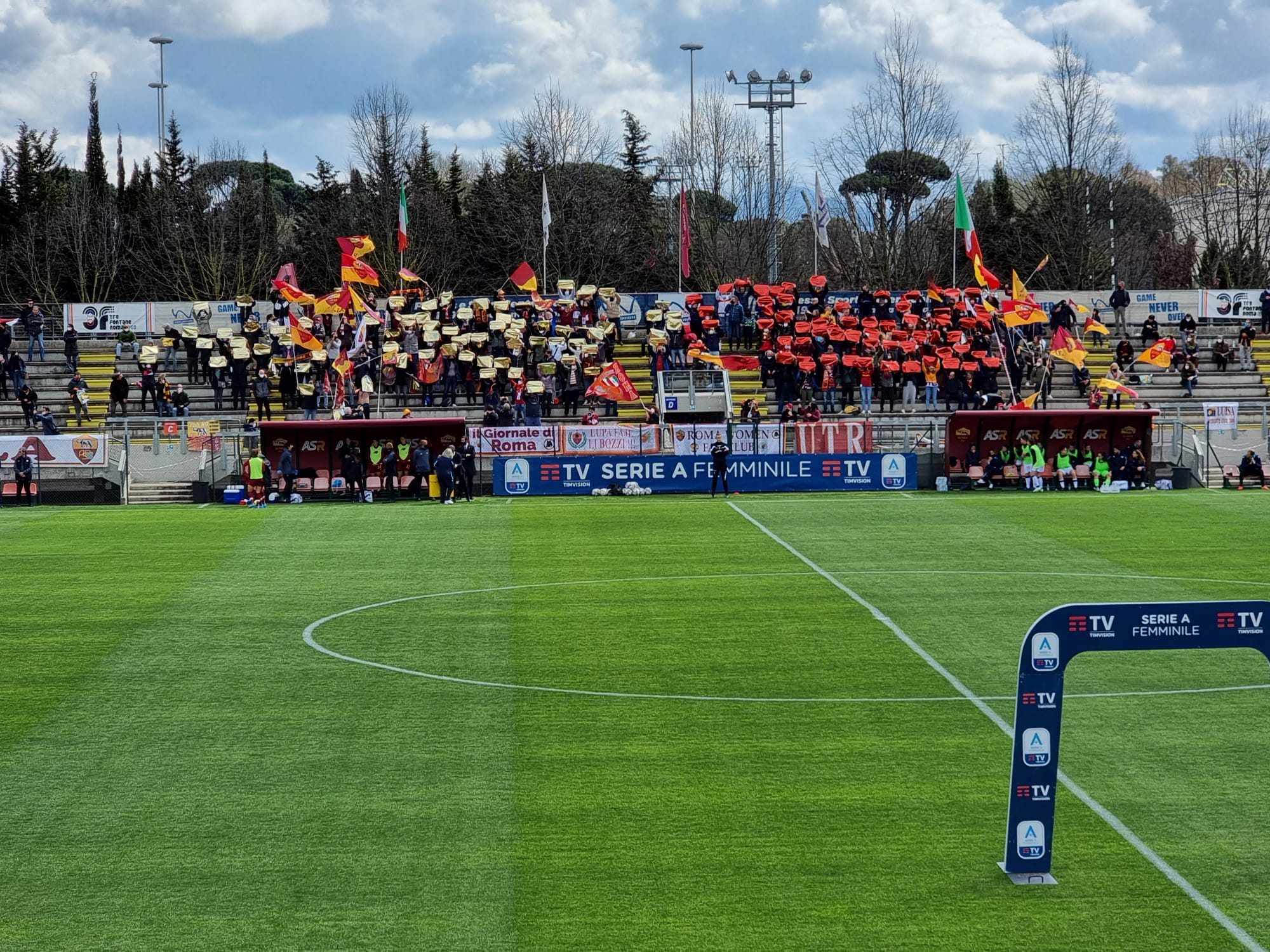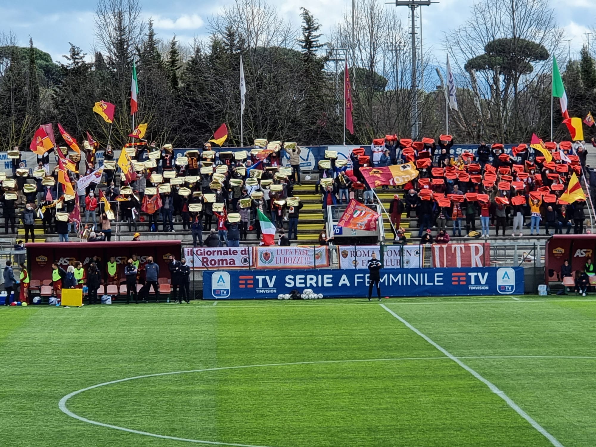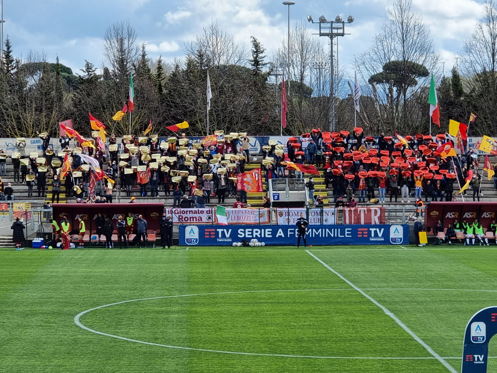 Per la sfida della Roma Femminile contro l'Hellas Verona, lo stadio Tre Fontane è tornato al 100% della capienza. Prima del fischio d'inizio, i tifosi giallorossi hanno realizzato una scenografia per supportare la squadra.